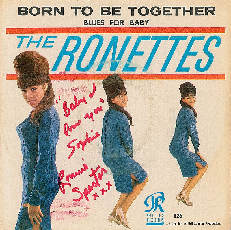 Scarce color Phillies Label 45 rpm picture sleeve for the Ronettes ‘Born To Be Together,’ signed and inscribed on the front cover in red felt tip, “‘Baby I love you’ Sophie. Ronnie Spector xxx.” She has added two red lipstick kisses. In very good condition with scattered light creasing, edge toning, light soiling, and a ‘ring of wear’ affecting portions of her signature and inscription.