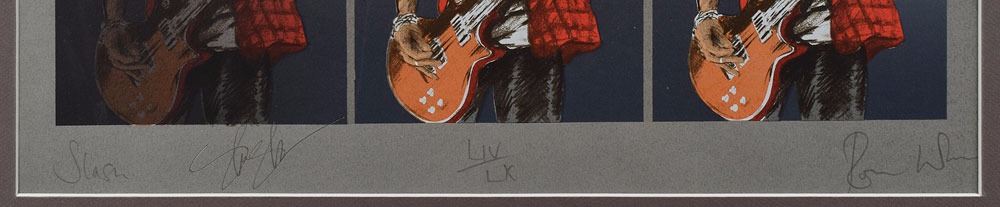 Tremendous color limited edition 20.5 x 28 serigraph of a stylized painting of Slash by Rolling Stones guitarist Ronnie Wood, numbered 54/60, signed in the lower border in pencil by Slash and Wood. Matted and framed to an overall size of 26.5 x 34.25. In fine condition.