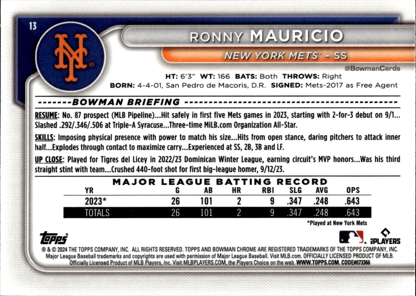 Ronny Mauricio RC Mega Box Mojo 2024 Bowman Chrome #13
