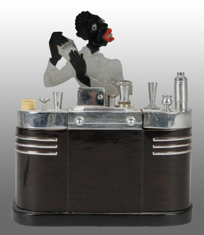 Description 1906. “Touch tip” cigarette lighter and cigarette box. Probably one of the best known and most sought after Ronson Touch Tip Lighters. This is a large desk top lighter with super Art Deco styling, featuring a Black man behind the bar ready to serve up a drink. The top of the bar has several glasses and a short stack of coasters. Each end of the bar opens and lifts cigarettes. The Touch Tip mechanism was a real triumph for Ronson and became an overnight success. The basic operation consists of a wand that carries the flame to your objective and the mechanism that produces the spark to ignite the wands tip. The body of each lighter contains a reservoir of Lighter Fluid to facilitate many lights and infrequent fillings. Condition (Excellent). Size 6" x 7".