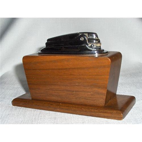 Ronson VARAFLAME Oak Cased Desk Lighter, made by Ronson, England, circa 1957. This is a gas butane lighter that was a breakthru in the lighter market in the 1950's. It has the first multi refillable gas inlet-valve combined with the first burner-valve that is hand adjustable. Around the same time the multi-filled cartridge to refill the varaflame came along. This was a step ahead of all the rest. It became one of the top seller's of the time. This one has an ID tag on the bottom stating "Trophy Varaflame". The condition on this piece is excellent. The lighter is chrome with a blue stone on the adjuster wheel. The lighter sits snugly in an oak Art Deco case. This lighter will make a great statement on any desk or table. See photos. Have a glance at my other items. Thank you for viewing. Lighters are NOT shipped with flint or fuel due to safety reasons.