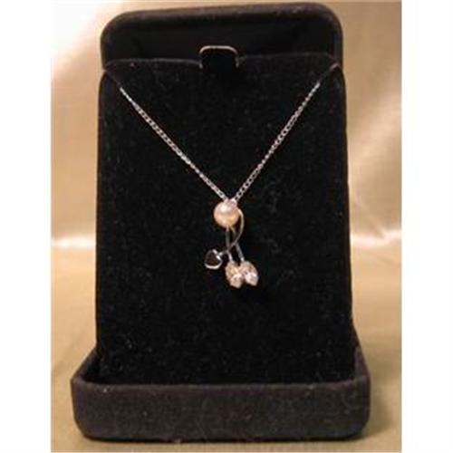 This lovely necklace is mint in the original black velvet box. The necklace is sterling with a real cultured pearl and two rhinestones for a very dressy look. The pendant measures alightly over 3/4 inch tall and is suspended from a 16 inch sterling chain. It is signed, and marked STERLING on the back. This would make a great Christmas gift!