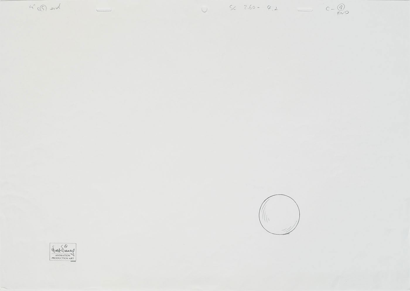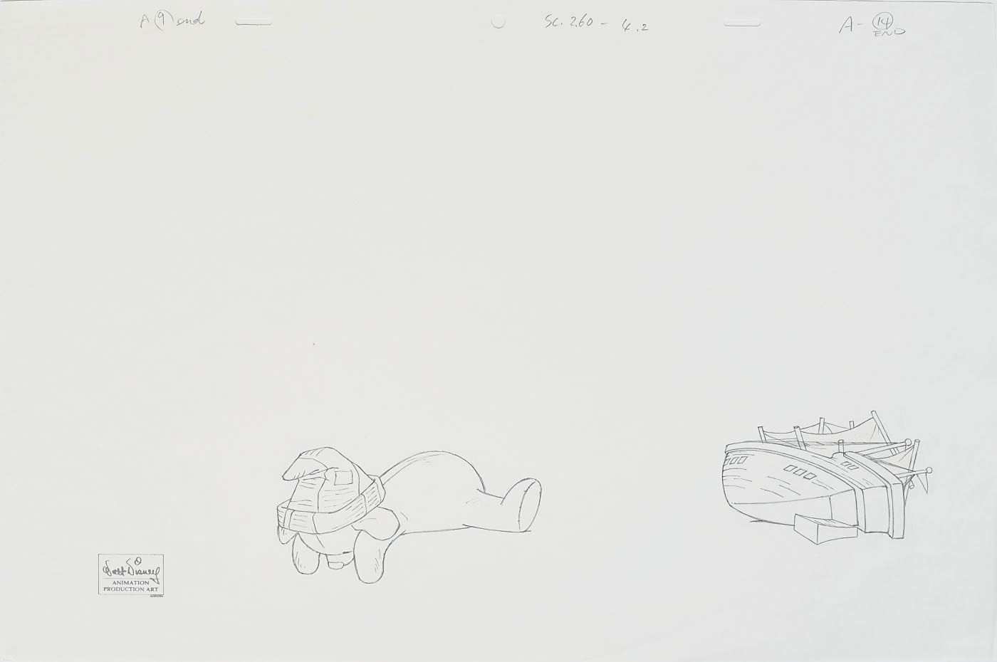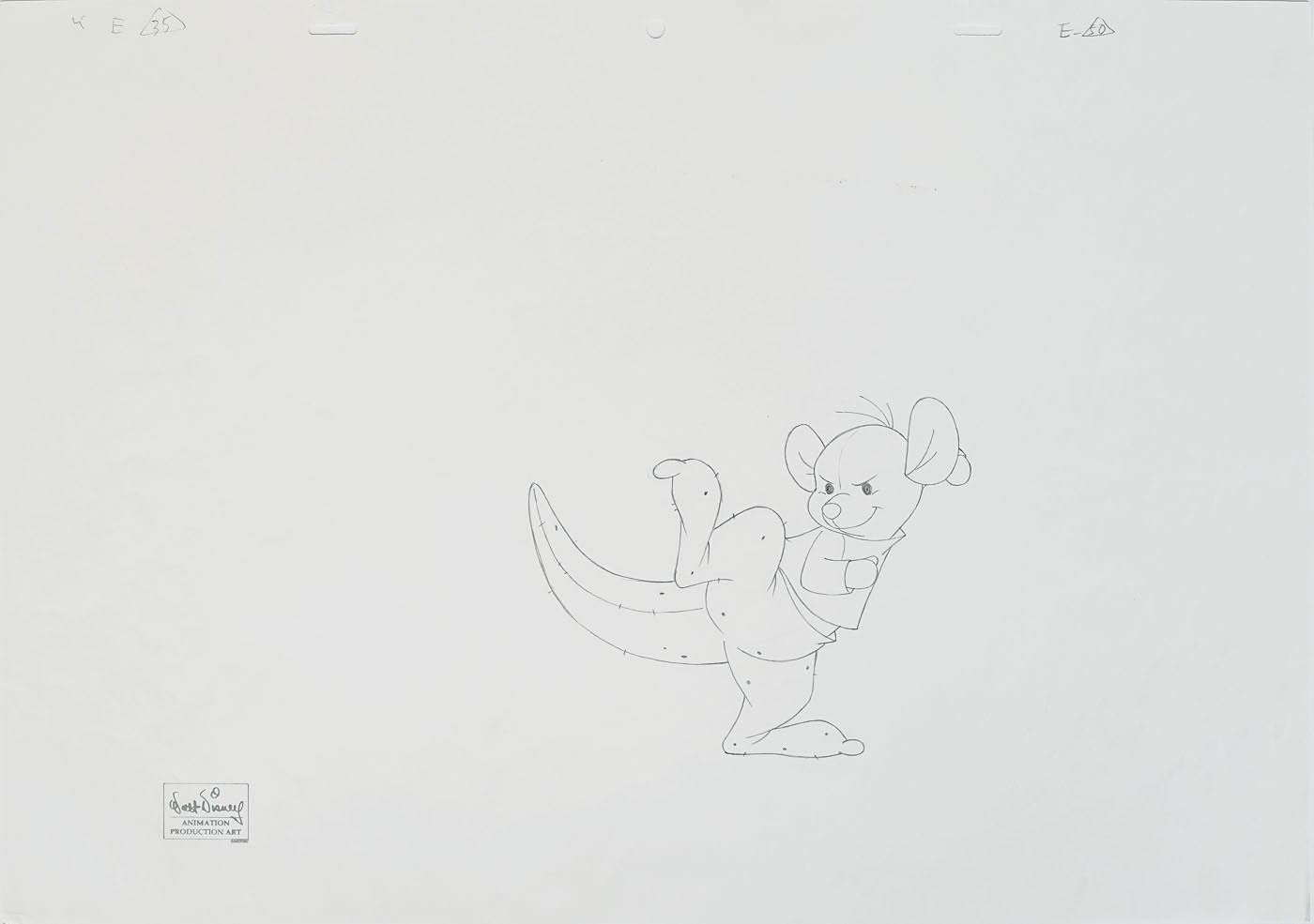 (Walt Disney Studios, 2000) Original production key master background set-up and matching production drawings featuring Roo from The Tigger Movie, depicting the young kangaroo wearing his pajamas and poised to leap from a dresser after having just crashed into its various toys. The cels are placed on a fantastic hand-painted production background from the same film. Total image measures 10.5 x 5, with overall dimensions of 17.5 x 13. The three matching production drawings are accomplished in graphite on individual untrimmed 16.5 x 11.75 sheets of animation paper. Also includes a ‘Winnie the Pooh & the Family Tree’ production folder, marked as “Prod. 4357–700, Seq. 2–60, Scene 4.2, Footage 6:00,” with director’s notes in English and Japanese: “Don’t animate Roo looking too much in pain. His determination should make the crash comedic, not painful. He gets up again right away.” Included with the folder are two Walt Disney Pictures & Television camera exposure sheets, both 16.25 x 17, copiously annotated in graphite and color pencil for the same filming sequence. The cel and drawings each bear silver Walt Disney stamps. In overall fine condition, with a missing corner tip to one drawing. Accompanied by a certificate of authenticity from Disney Enterprises, Inc. Released in early 2000, The Tigger Movie was originally titled Winnie the Pooh and the Family Tree.