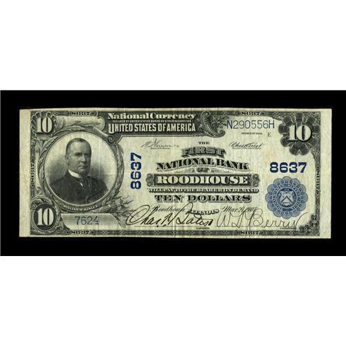 <B>Roodhouse, IL</B></I> - $10 1902 Plain Back Fr. 626 <B>The First NB</B></I> Ch. # 8637<BR>This $10 is adorned with black pen signatures. <B>Very Fine-Extremely Fine.</B></I><BR><BR><b>Shipping:</b> Coin/Currency (<a target="_blank" href="http://www.heritageauctions.com/common/shipping.php">view shipping information</a>)