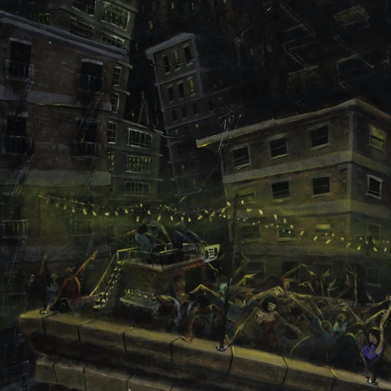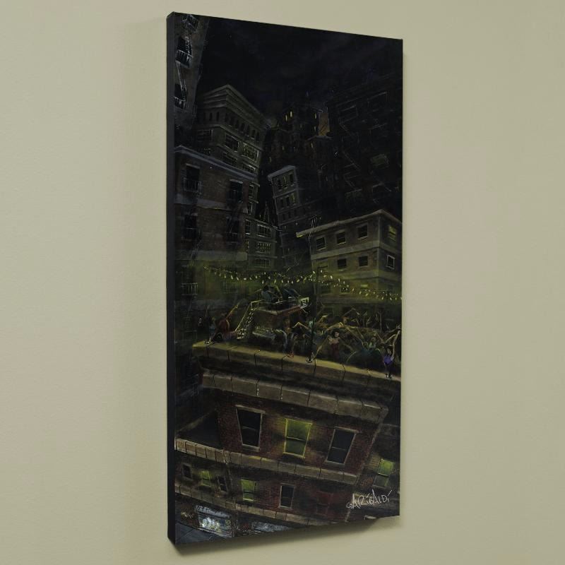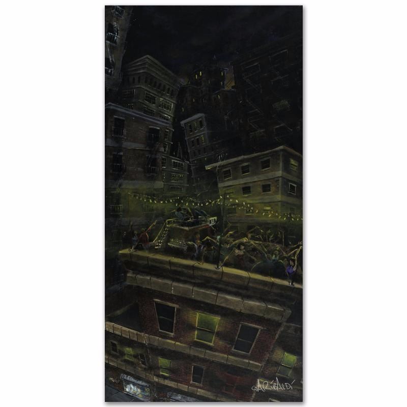 Combining his passions for music and art, David Garibaldi creates visual poetry. "Roof Party" is a limited edition giclee on stretched canvas, E numbered and bearing the artist's authorized signature. This piece is gallery wrapped and ready to hang. Includes Certificate of Authenticity! Measures approx. 24" x 48" (image).