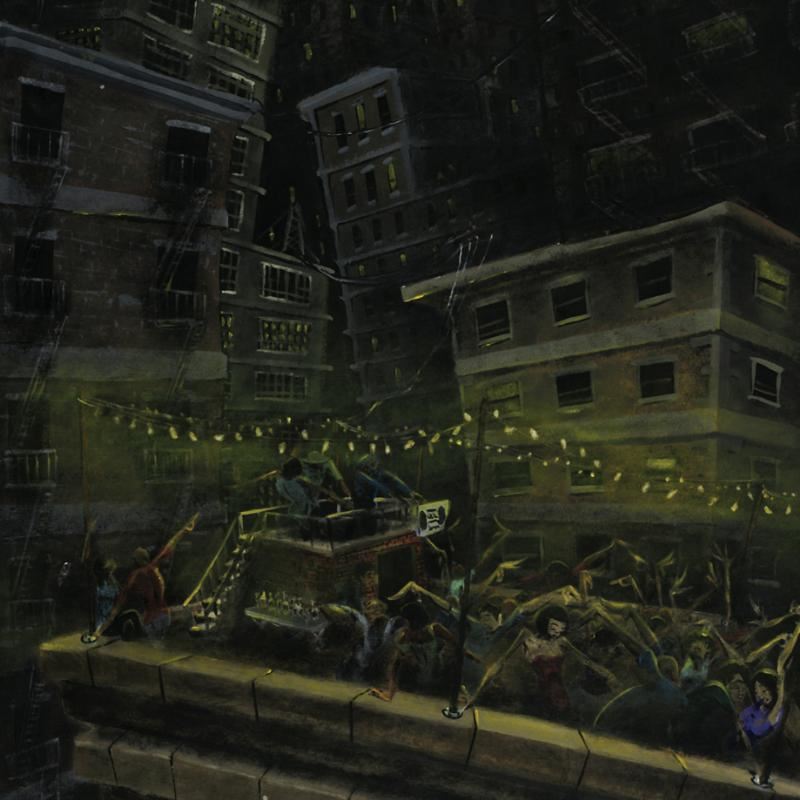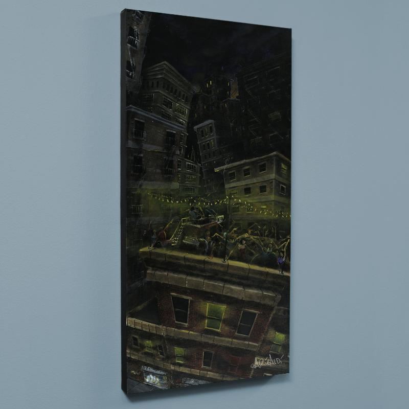 Combining his passions for music and art, David Garibaldi creates visual poetry. "Roof Party" is a limited edition giclee on stretched canvas, M numbered and bearing the artist's authorized signature. This piece is gallery wrapped and ready to hang. Includes Certificate of Authenticity! Measures approx. 36" x 72" (image).