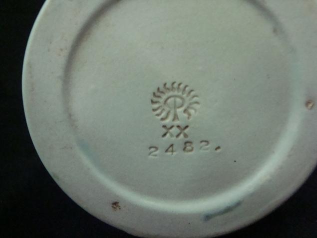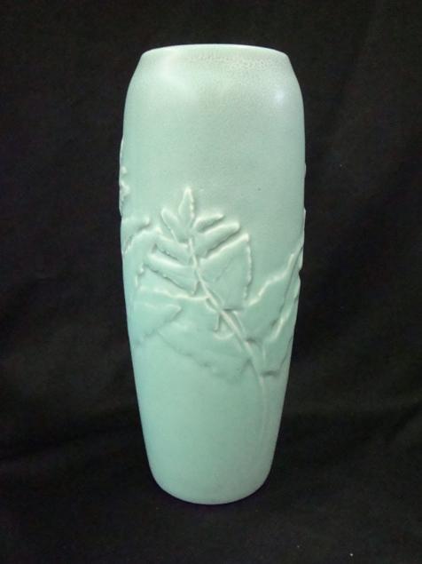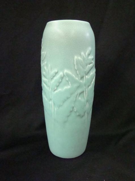 Rookwood Vase, of ovoid form encircled by a continuous raised molded design of interlocking life-size fern fronds below the rounded shoulder, a flowing soft green glazed finish, an incised Rookwood mark, date mark XX for 1920, shape #2482. Height 11 1/2 inches, diameter at rim 3 1/2 inches.