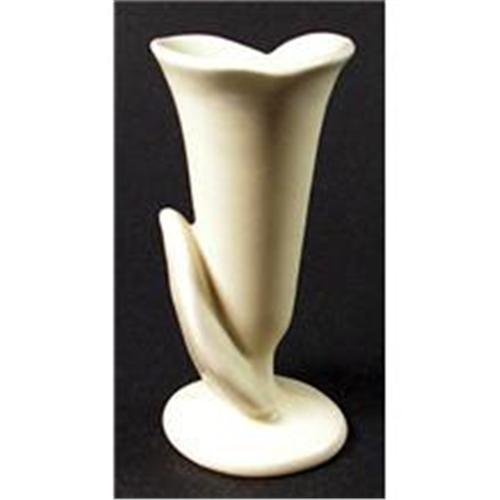 Produced by Rookwood and marked - XLIX [1949] - 6591. This elegant cream pottery vase formed into an exquisite Calla Lily measures 4 3/4 inches tall and is in excellent condition.
