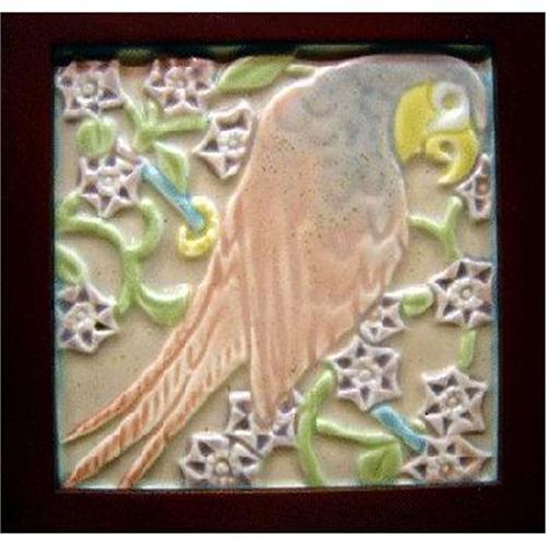 </font></strong>Colorful Rookwood Parrot trivet, nicely framed in a mahogany frame, dated 1919, shape #3077, 5.5"sq, with frame 10.5"sq Excellent condition, free from any chips, cracks or repairs. </font>