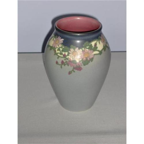 The vase, a #4 shape, is in a baluster shape in a light blue matte glaze. It has a pink and white daisy design with trailing buds and leaves on a cream background. The design of the daisies falls into three (3) "cartouches" as it travels around the top of the vase. The vase has a grey-blue rim at the top and a mauve interior.<p>