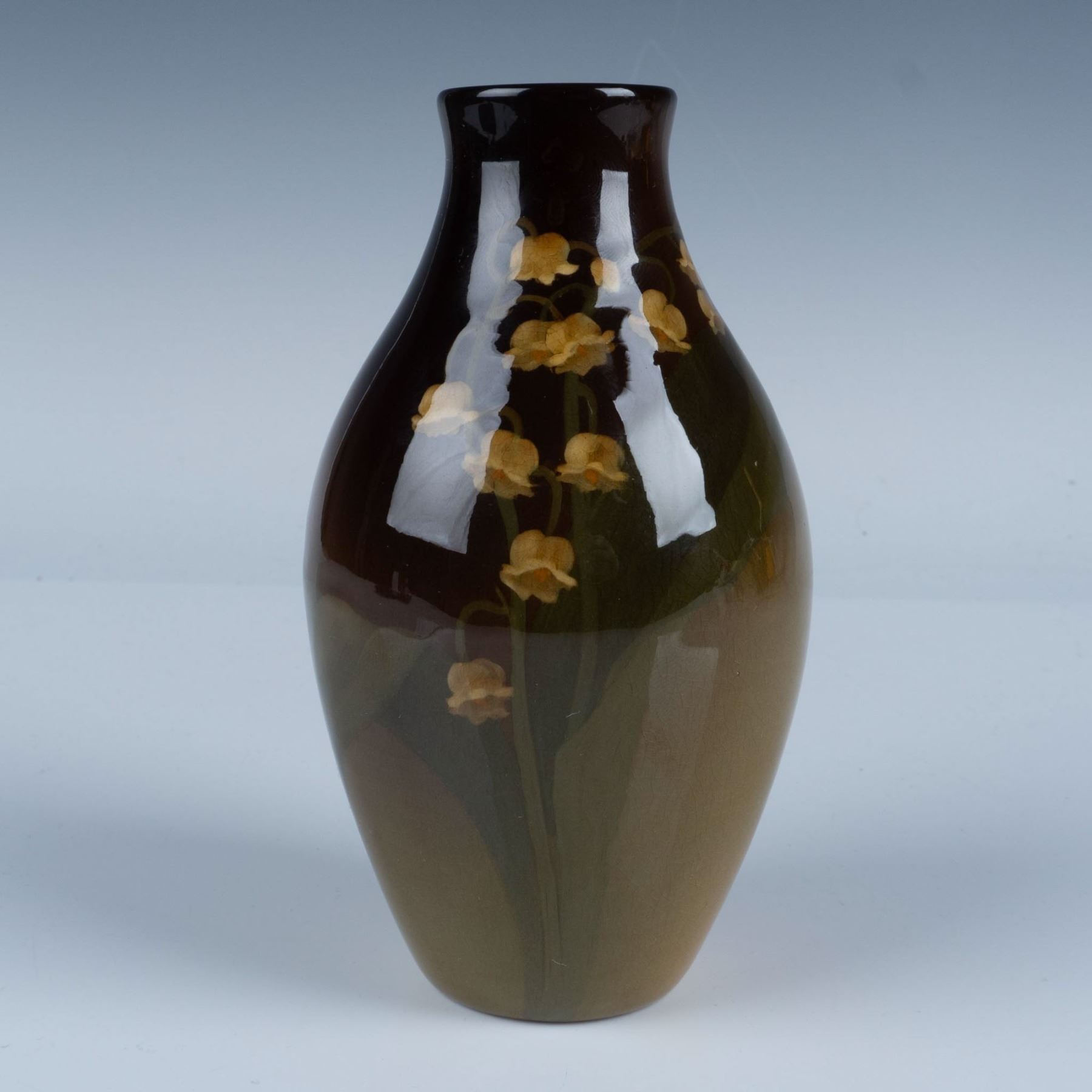 A small high glazed vase in a dark brown, green, and orange tones. Beautiful adorned with hand painted Lily of the Valley flowers. Rookwood impressed stamp. Marked IV. Shape 741, C. Artist marked.
