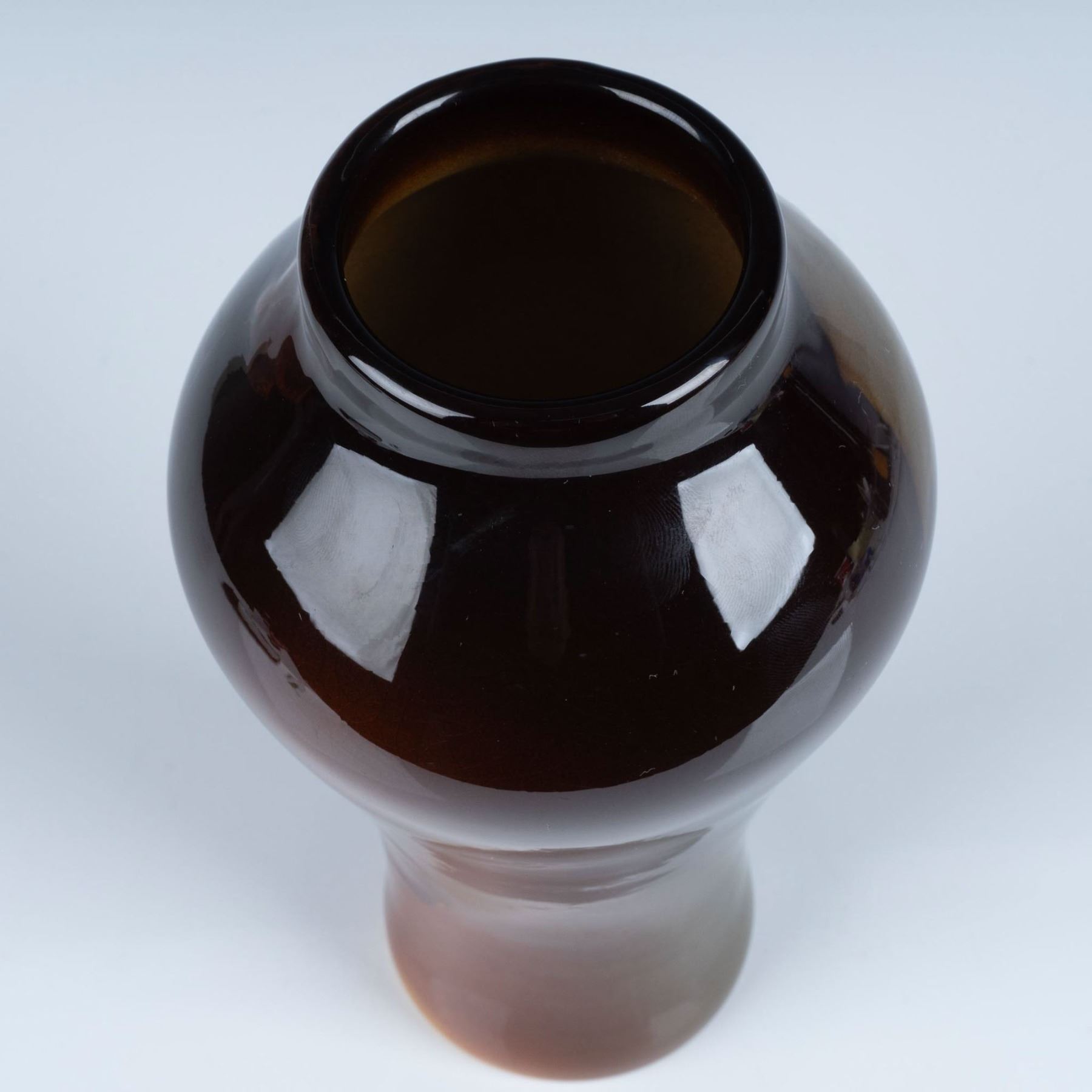 Designed by Edward Timothy Hurley, a dark brown glaze vase decorated with orange hibiscus. Rookwood impressed stamp. Marked III. Shape 909, C. Artist marked.