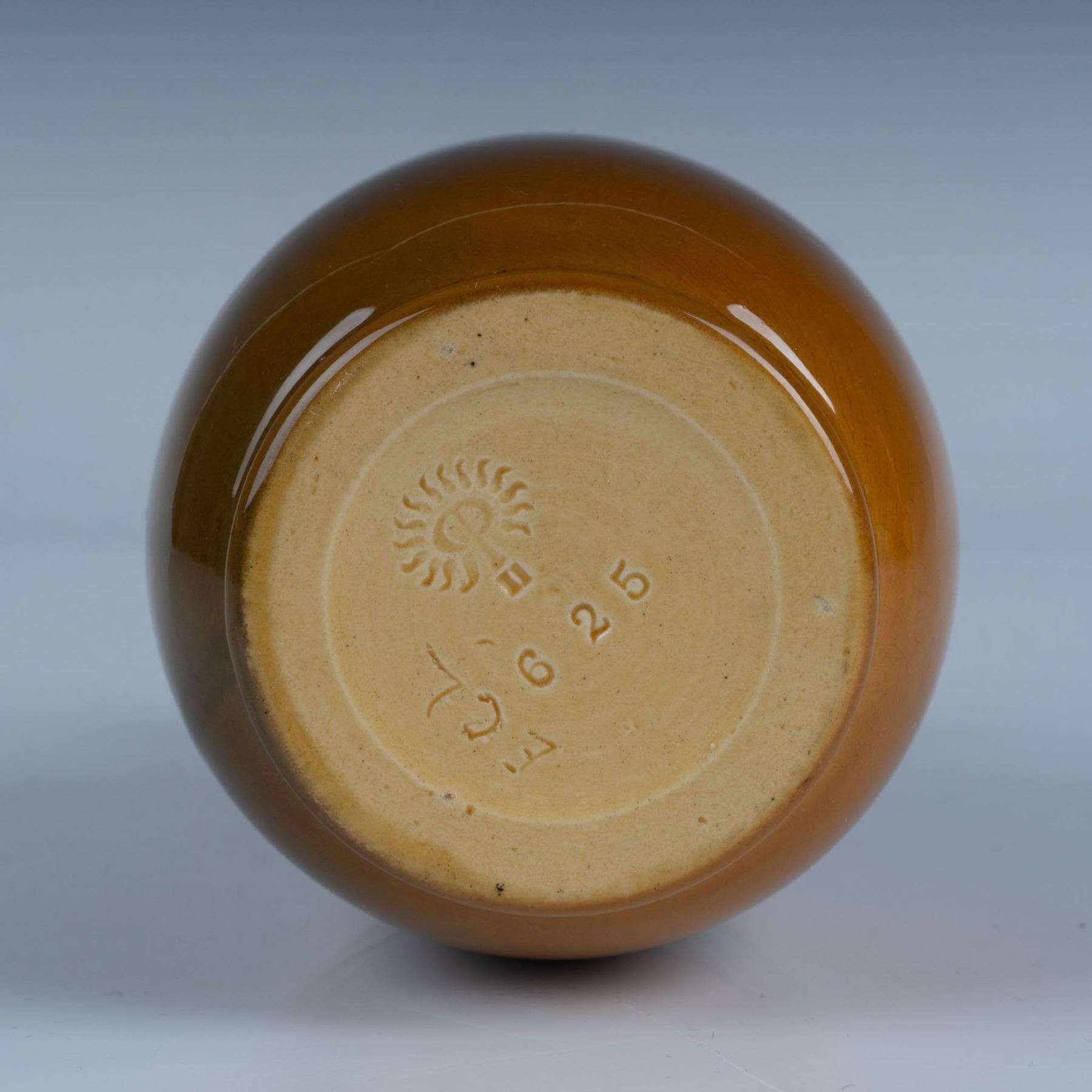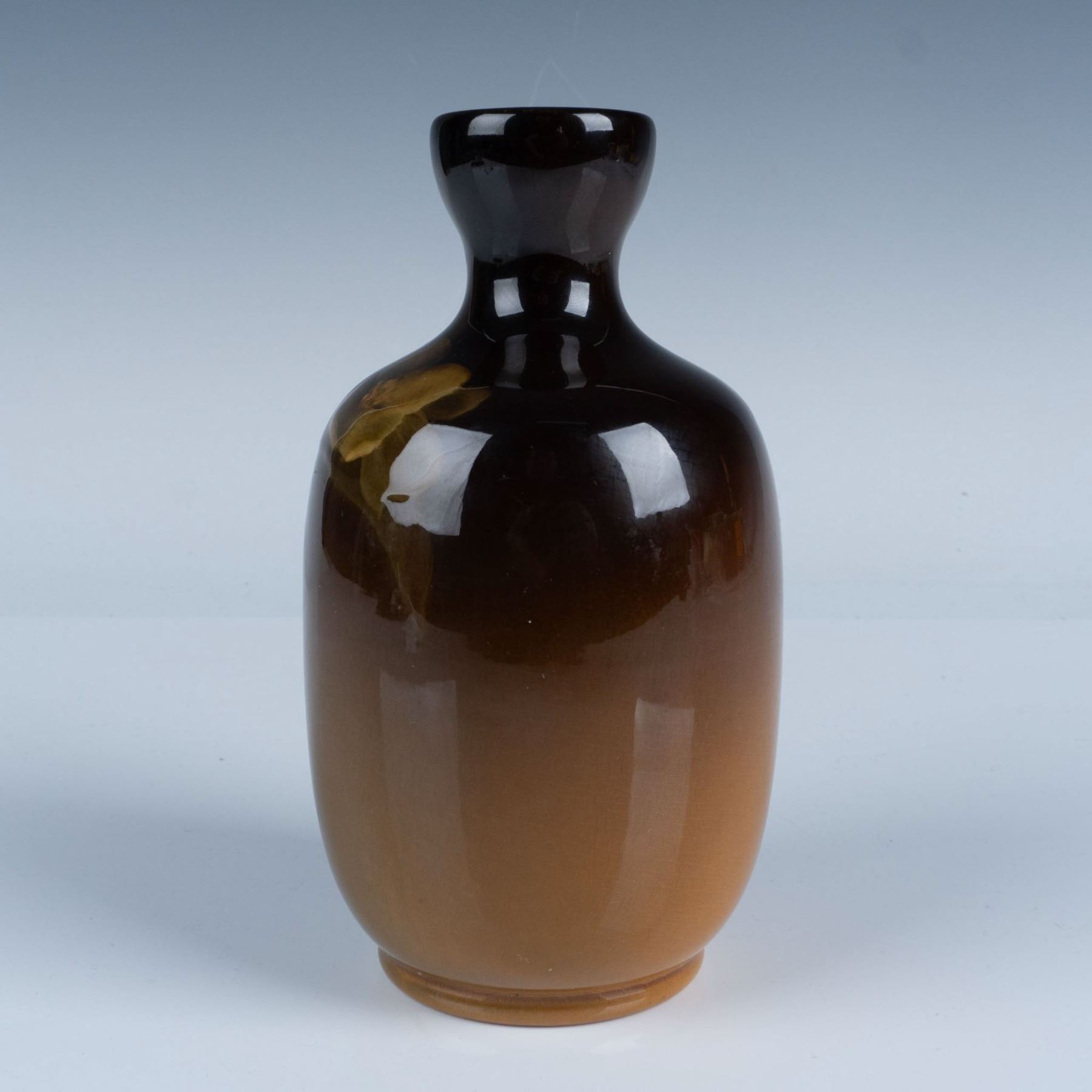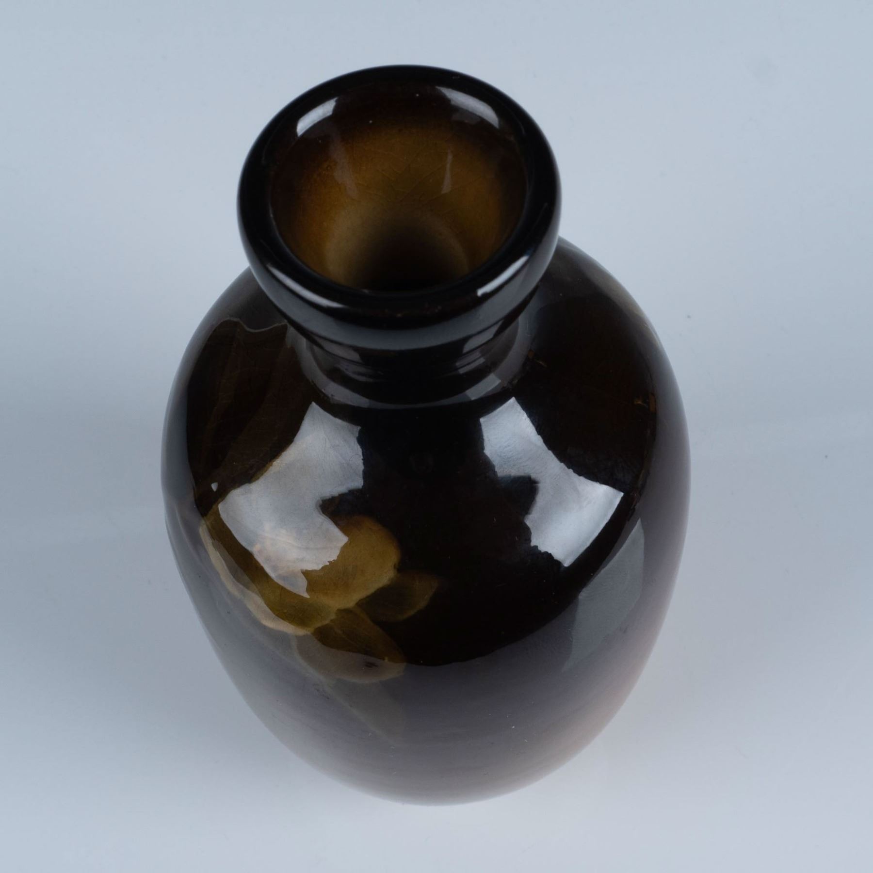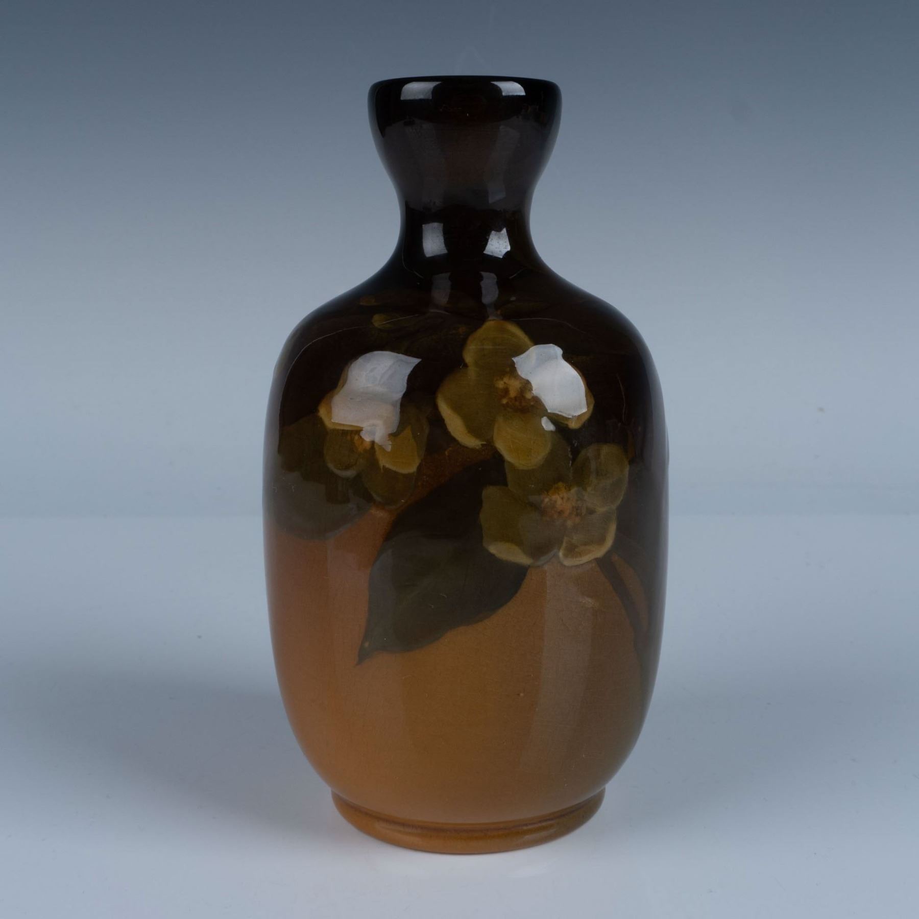 Designed by Eliza Lawrence, a small table vase in a brown and orange high glaze. Hand painted mock orange flowers adorns the vase. Rookwood impressed stamp. Marked II. Shape 625. Artist marked.