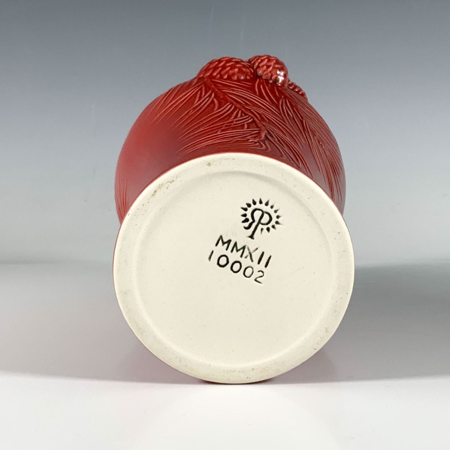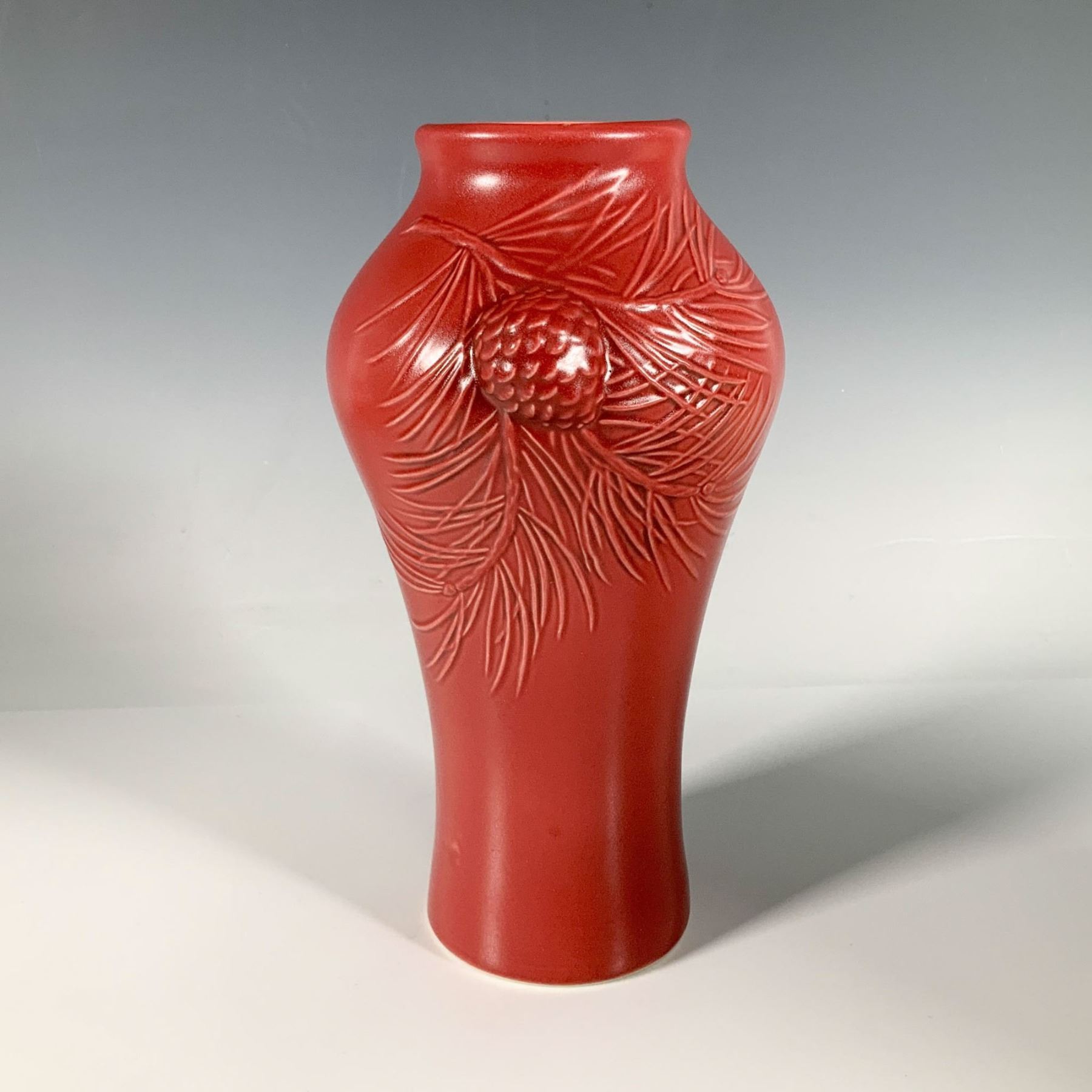A semi-matte decorative vessel featuring a rich, deep red glaze, adorned with an intricate pinecone with leaves high-relief design. Rookwood MMXII 10002 impressed.