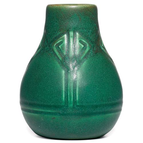 Rookwood vase, squat form with incised design under a green matt glaze, made in 1905, #969E, 4"h, unchipped chip to rim