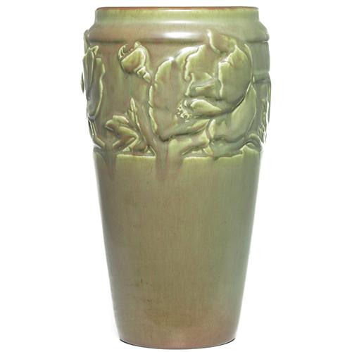 Good Rookwood vase, tapered form with poppy design under a green and brown matt, made in 1930,#1710,10.5in.h