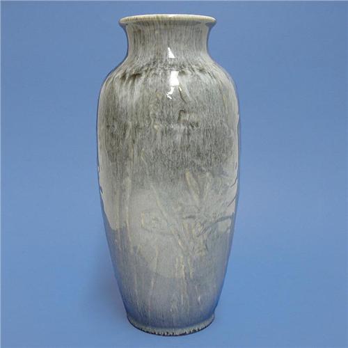Rookwood vase with waterfall blue glaze over raised floral design; designed by Katero Shirayamadi; 1940's; 12" high; no visible defects