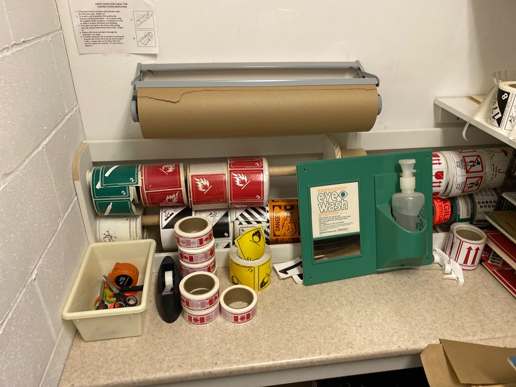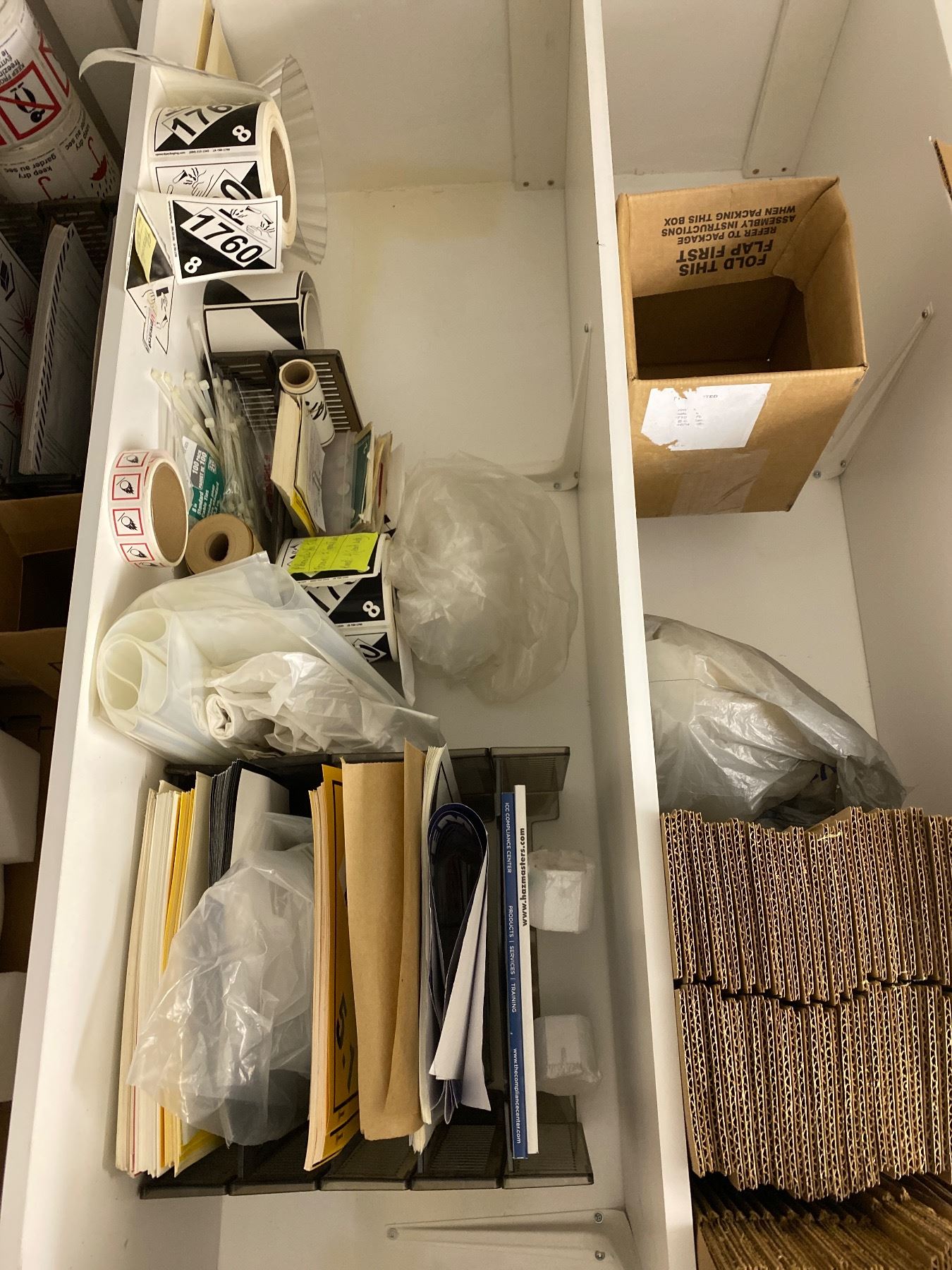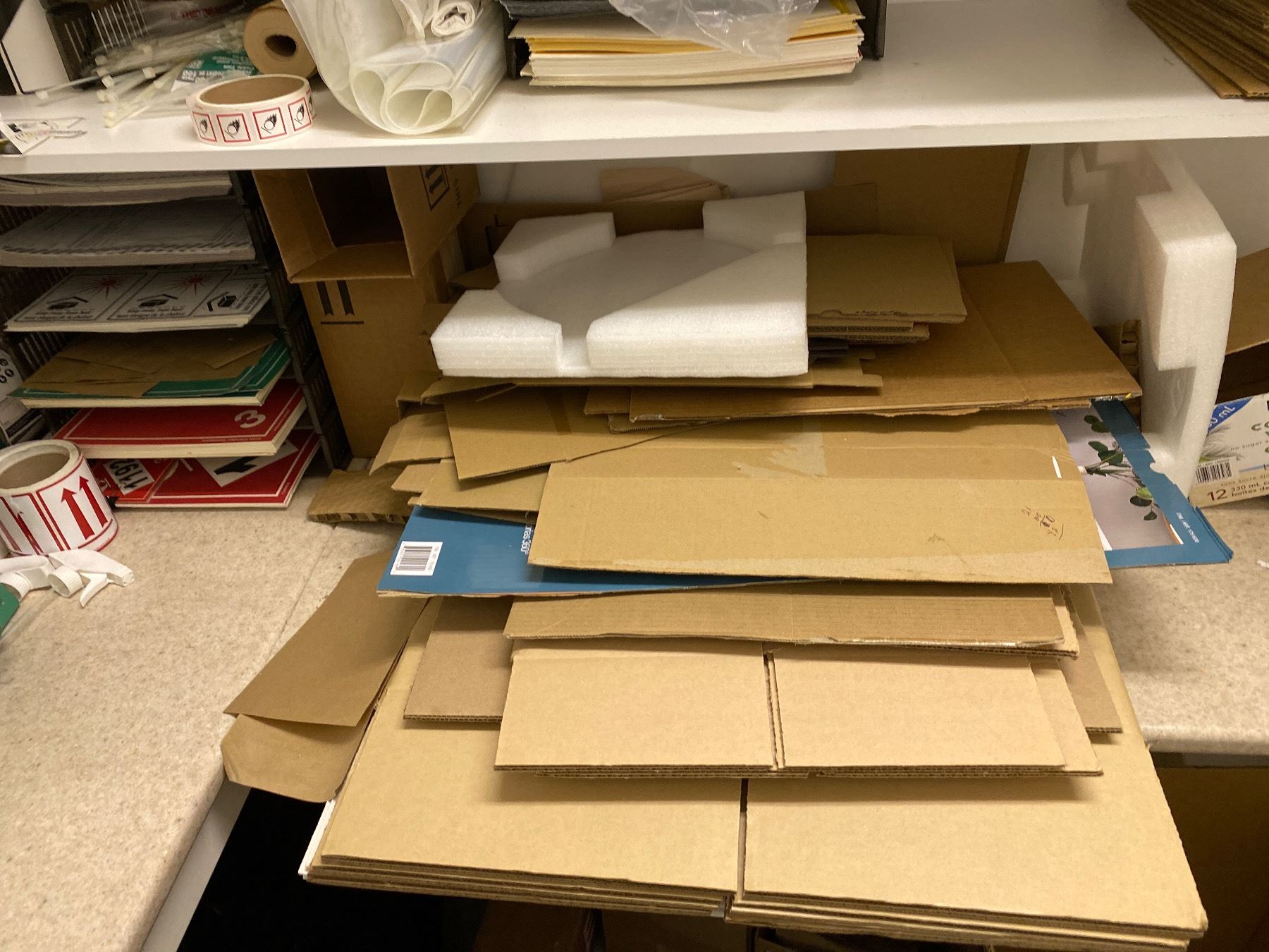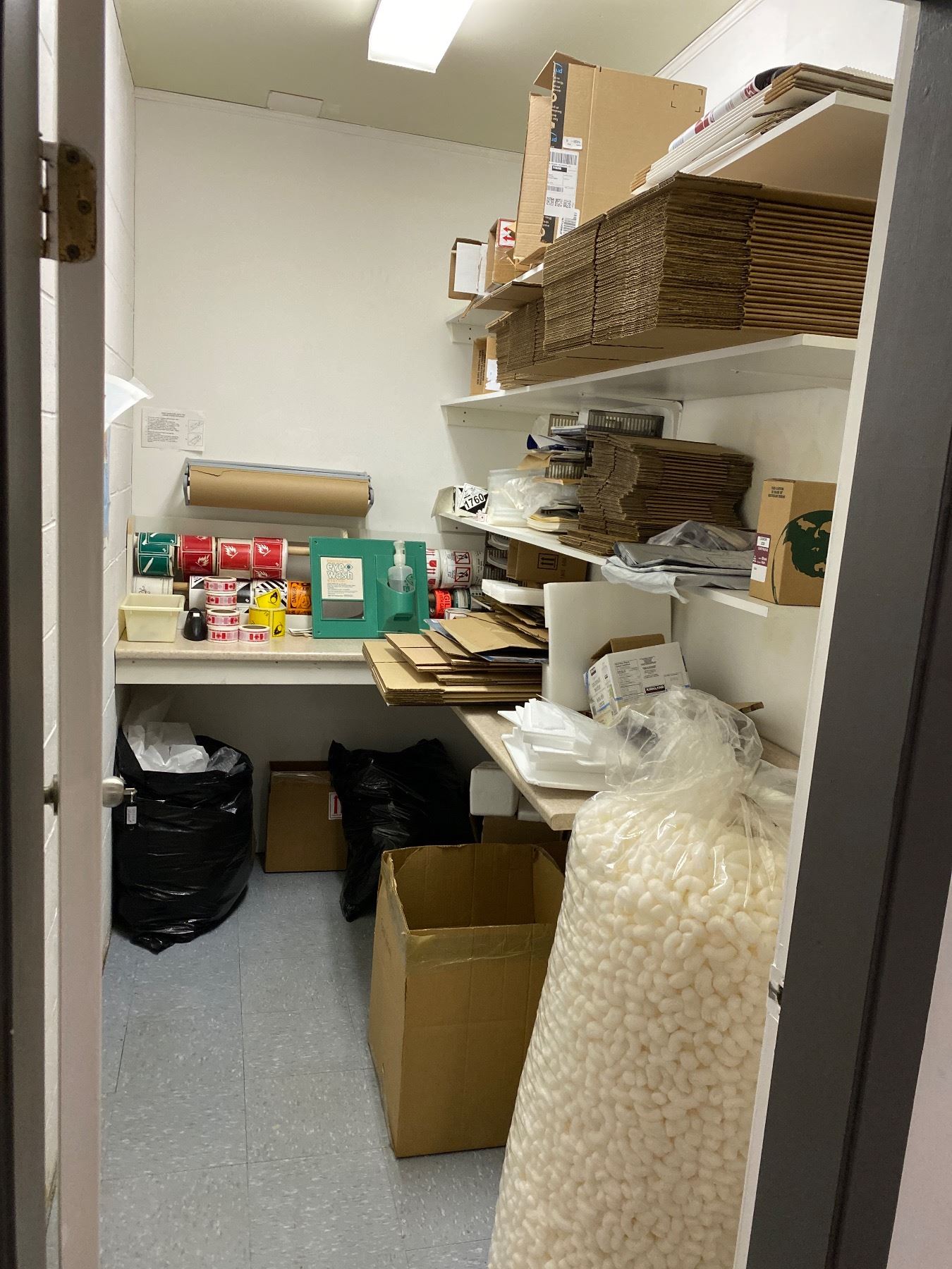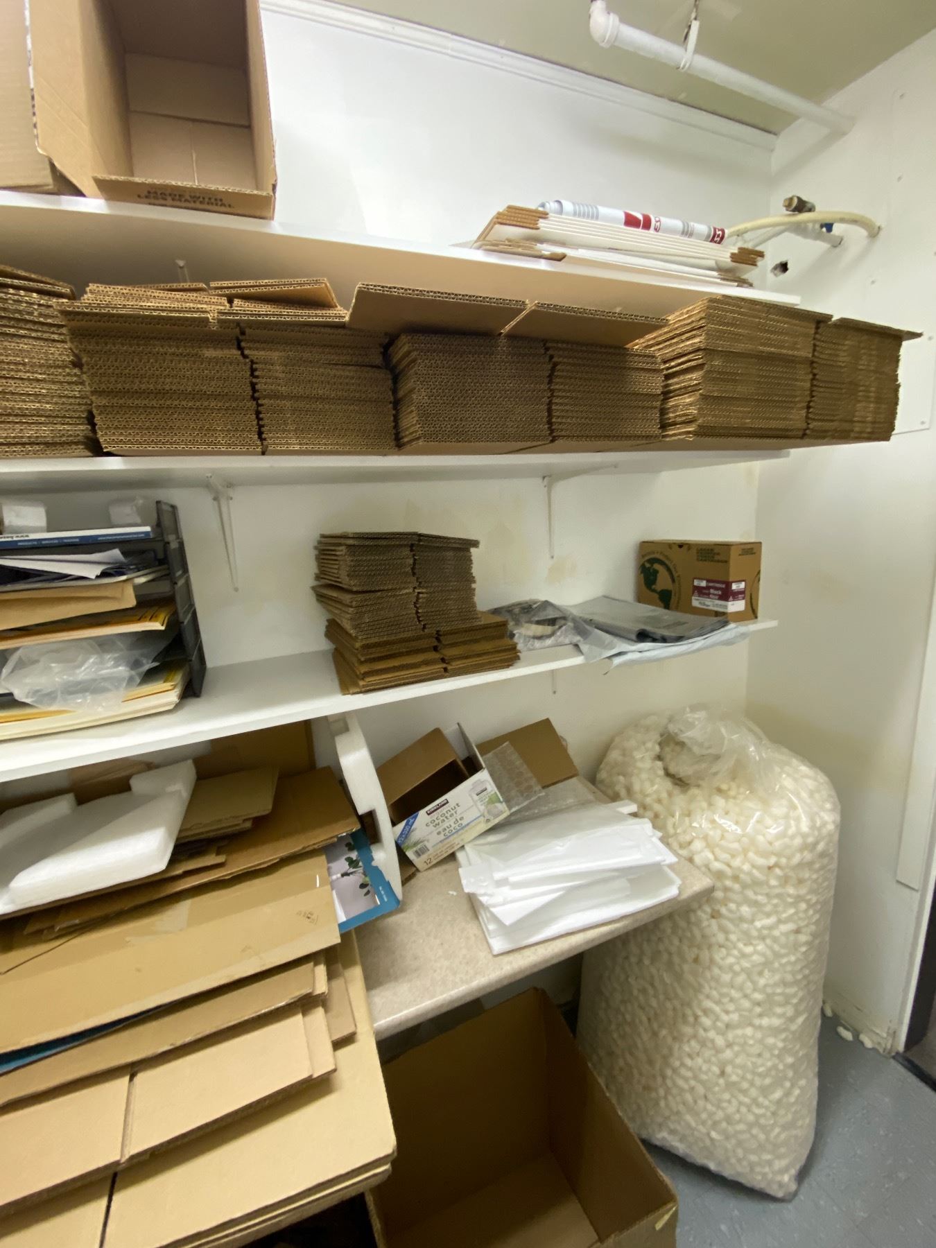 Room lot - Contents of room including hazardous sticker rolls, packing peanuts, misc. size cardboard boxes, packing paper roll, zap straps, car brush, etc.