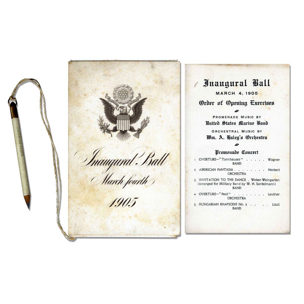 Charming program -- with attached dangling pencil, for filling in one's dance card -- for the 1905 inaugural ball for President Theodore Roosevelt. Booklet for the 4 March 1905 ball runs 16 pages, and lists each song to be performed, the evening's menu and inaugural committee members. Measures 3'' x 4.75'' with accompanying pencil attached by string. Moderate soiling, in very good condition.
