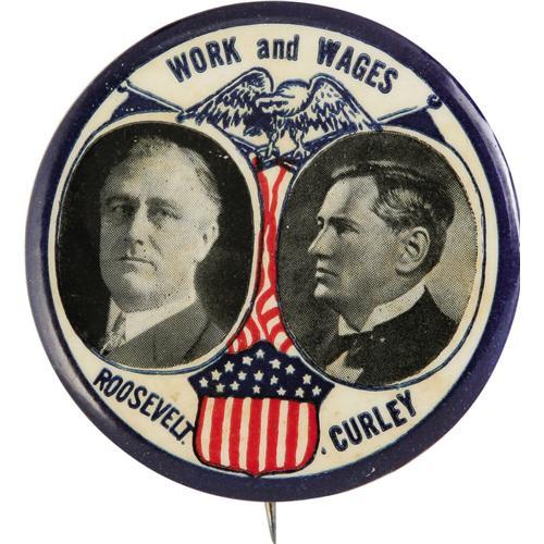 <B>Roosevelt & Curley: A Dramatic Large Coat-Tail Jugate From the 1932 Campaign.</B></I> This 2 1/8" design is considered by many to be one of the most beautiful of all jugate buttons. It also comes in a Roosevelt-Garner version, deemed by most to be the best FDR jugate. Curley was the mayor of Boston and a powerful political boss. Usually with buttons of this type the local candidate is seeking to ride on the coat-tails of the presidential candidate. In the case of this issue, it might well have been the other way around.<BR><BR>It comes in two versions, the other reading "Economic Security" at the top. This is the scarcer version, in excellent shape but for several trivial surface bumps.<BR><BR><b>Shipping:</b> Miscellaneous Collectibles, Smal (<a target="_blank" href="http://www.heritageauctions.com/common/shipping.php">view shipping information</a>)