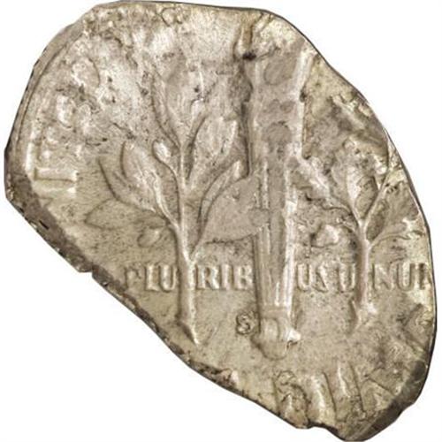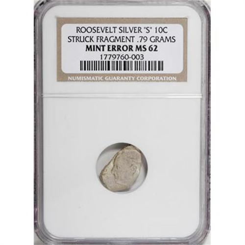 <B>Undated San Francisco Silver Dime--Struck Fragment--MS62 NGC.</B></I> Whispers of pink, orange, and silver-gray patina visit the unworn surfaces of this roughly wedge-shaped struck fragment. While no part of the date is visible, an 'S' mintmark is present just to the left of the torch. An intriguing error piece that hails from somewhere in the decade from 1946 to 1955.<BR><BR><B>Coin Engraver:</B> John R. Sinnock<BR><BR><b>Shipping:</b> Coins & Currency (<a target="_blank" href="http://www.heritageauctions.com/common/shipping.php">view shipping information</a>)