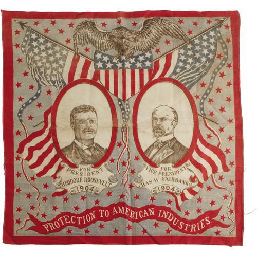 <B>Roosevelt & Fairbanks: Colorful 1904 Bandanna.</B></I> Near mint, with just a couple of trivial light brown marks, mentioned for accuracy, An approximately 23" square bandanna picturing 1904 Republican candidates Theodore Roosevelt and Charles W. Fairbanks. Scarce this nice.<BR><BR><b>Shipping:</b> Miscellaneous Collectibles, Smal (<a target="_blank" href="http://www.heritageauctions.com/common/shipping.php">view shipping information</a>)