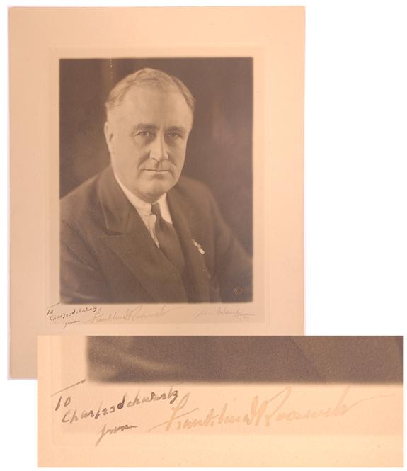 Roosevelt, Franklin D. Sepia-toned photograph inscribed and signed, "To Charles Schwartz from Franklin D Roosevelt," as President, n.p., n.d. Photo by Elias Goldensky, a prominent portrait photographer in Philadelphia, who signed in pencil with the date "33" at lower right. The ink in the inscription is darker than the ink in the signature. Once scratch in the emulsion. One light scratch in the upper left background, otherwise a beautiful chest-length portrait of FDR.