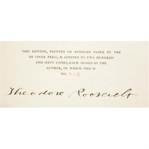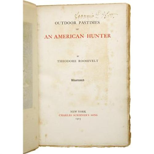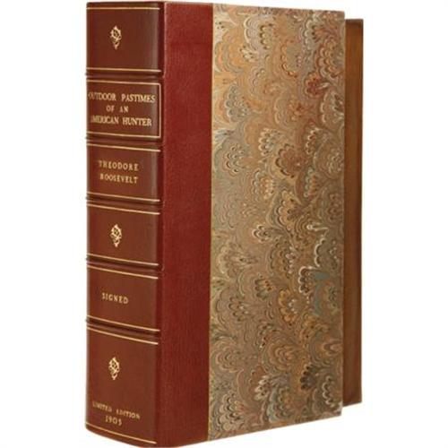 <B>Theodore Roosevelt: Limited First Edition, Signed as President, of </B></I><B><I>Outdoor Pastimes of an American Hunter.</B></I></B></I> Illustrated. (New York: Charles Scribner's Sons, 1905). First edition, limited to 260 numbered copies, each signed in full by the author (while President of the United States). Octavo (9.75” x 6.5”). xi, 369 pages. Complete with forty-nine full-page photographic plates, each with a captioned tissue guard. Publisher's original binding of half-leather over boards, lettered in blind on the spine. Hinges cracking but still very strong and sound, and typical light foxing and browning, and very minor soiling. Altogether, a very good to near fine copy of a scarce book. Housed in a custom quarter morocco book-backed slipcase with five raised bands and gilt lettering and tooling on the spine. Published while Roosevelt was President, this book contains accounts of his hunting trips in the West, his impressions of and experiences in Yellowstone Park, and a chapter on books about big game hunting. Because such a small number of this limited edition was issued, and even fewer were signed by Roosevelt as President, this offering is particularly desirable.<BR><BR><b>Shipping:</b> Books & Catalogs (<a target="_blank" href="http://www.heritageauctions.com/common/shipping.php">view shipping information</a>)