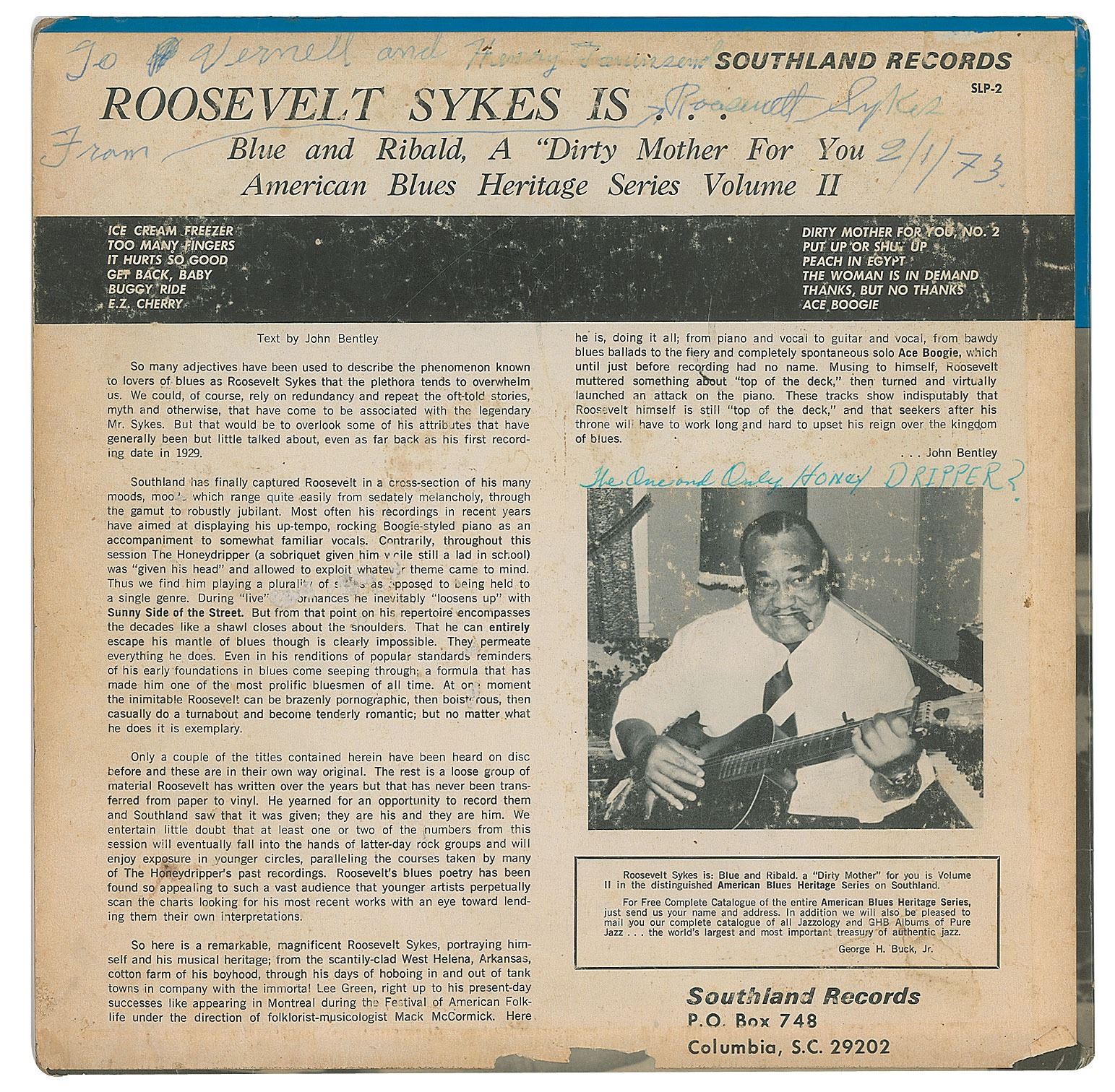 American blues musician known as 'The Honeydripper' (1906–1983) whose song '44 Blues' became a blues standard and his signature tune. Roosevelt Sykes Is Blue And Ribald…A 'Dirty Mother' For You album signed and inscribed on the back cover in blue ballpoint, "To Vernell and Henry Townsend, Roosevelt Sykes, 2/1/73." In very good condition, with scuffing, toning, and edge wear. The record is included. Blues singer Vernell was the wife of journeyman blues guitarist and St. Louis legend Henry Townsend.