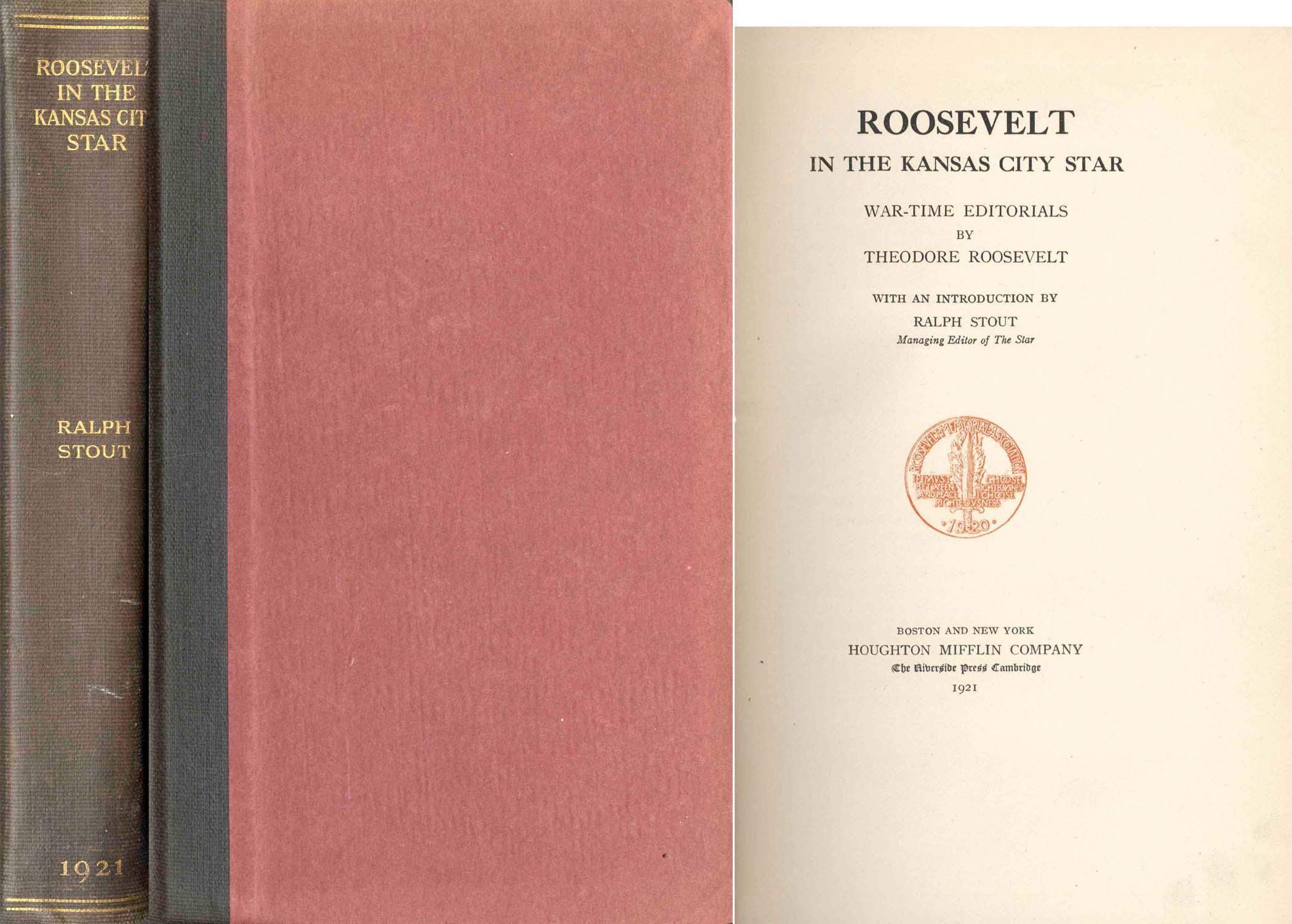 ''Roosevelt in the Kansas City Star: War-Time Editorials'' by Theodore Roosevelt with an introduction by Ralph Stout. Boston: Houghton Mifflin Co.: 1921. First edition hardcover octavo runs 295pp. A compendium of Roosevelt's articles from 1917-1919, including: ''Bolsheviki at Home and Abroad,'' ''The Dangers of Premature Peace'' and ''Murder, Treason, and Parlor Anarchy.'' Numbered 154 of a limited 375 copy run. Sunning to cloth boards. Gift inscription and stamps to front free endpaper. Very good condition.