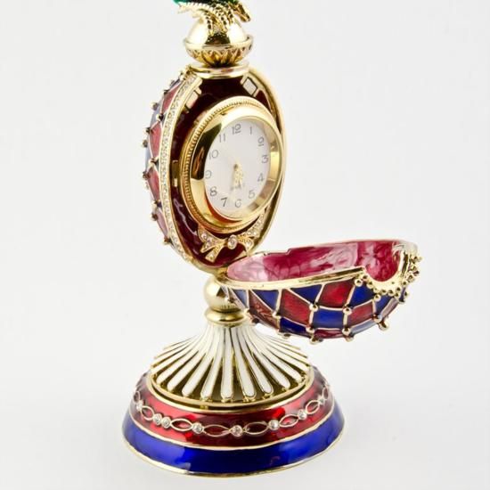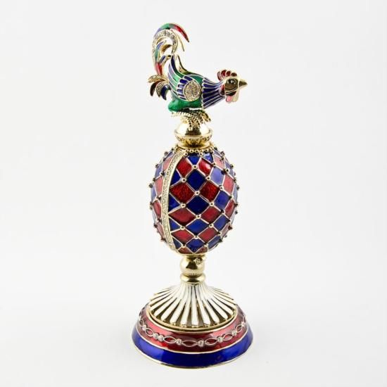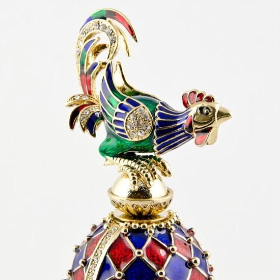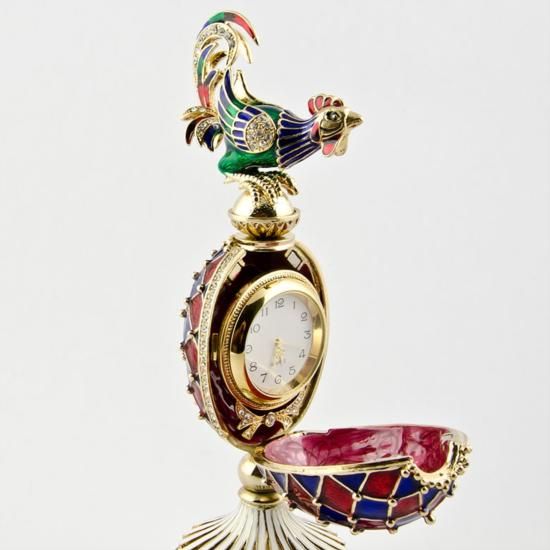 Rooster Clock Faberge Egg. Material: Pewter, Crystals, Enamel. Dimensions: 6.5in (H) X 2.5in (Base Diameter) 1.75in (Egg Diameter) The famed Faberge eggs are jeweled eggs, often with the most ornate, minuscule designs on them. The House of Faberge made the original pieces from 1885 to 1917. At that time, they became popular gifts given during the Easter season. Larger versions were made for the Russian royal family, including Alexander III and Nicolas II. Of these, 42 of the 50 originals exist today. Most Faberge eggs, though, were much smaller and hung from a chain around the neck. These eggs have precious metals on them or gemstone decorations, often with intricate detailing. These are a symbol of luxury and thought of as individual masterpieces.