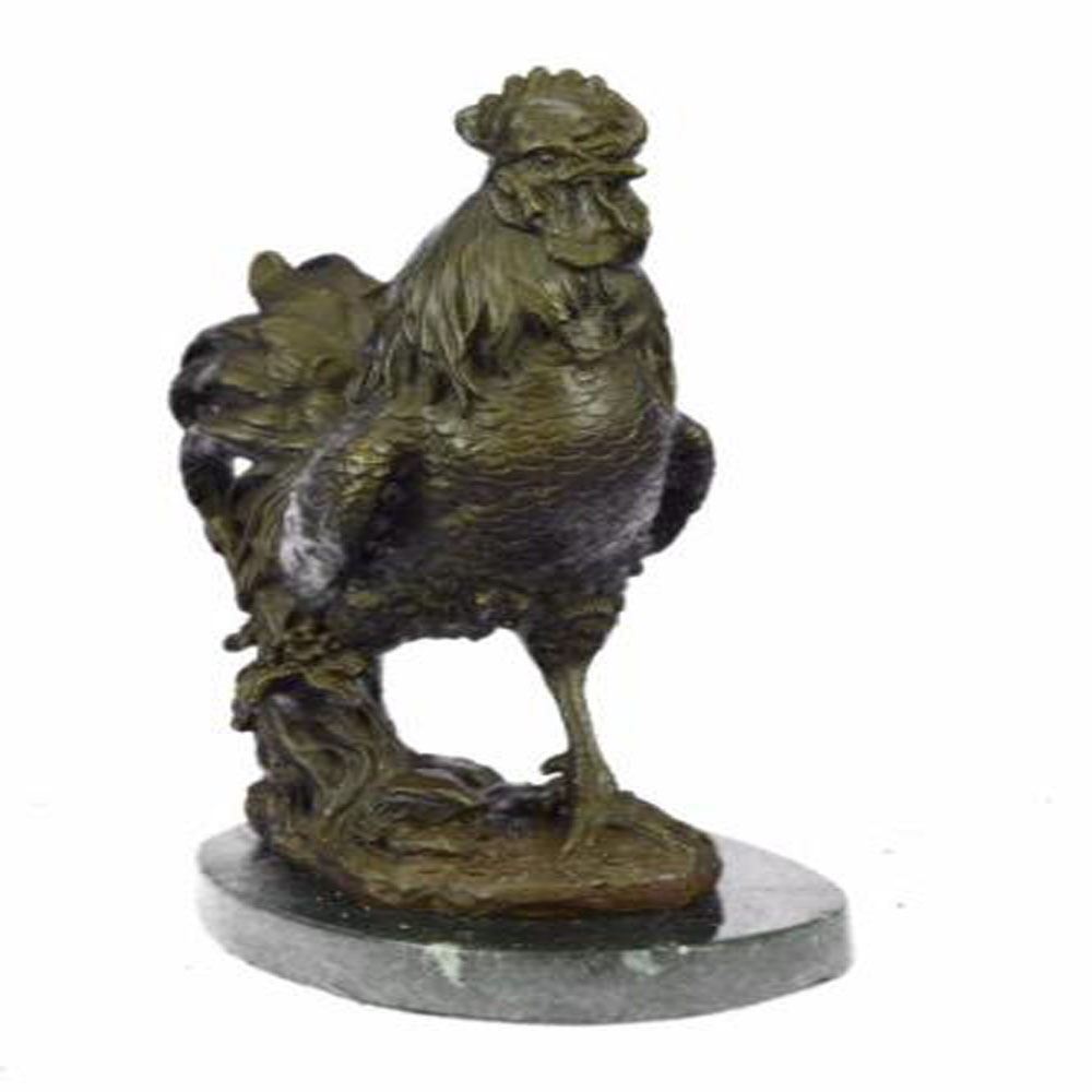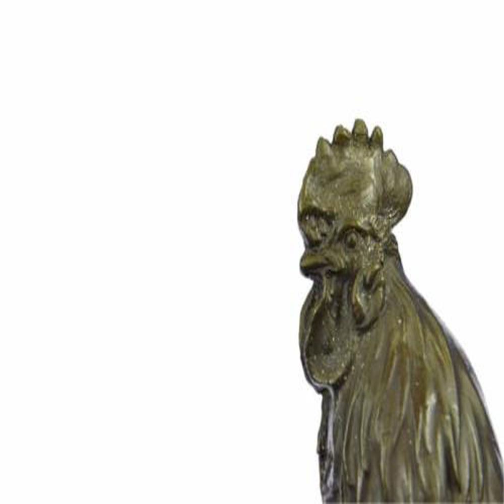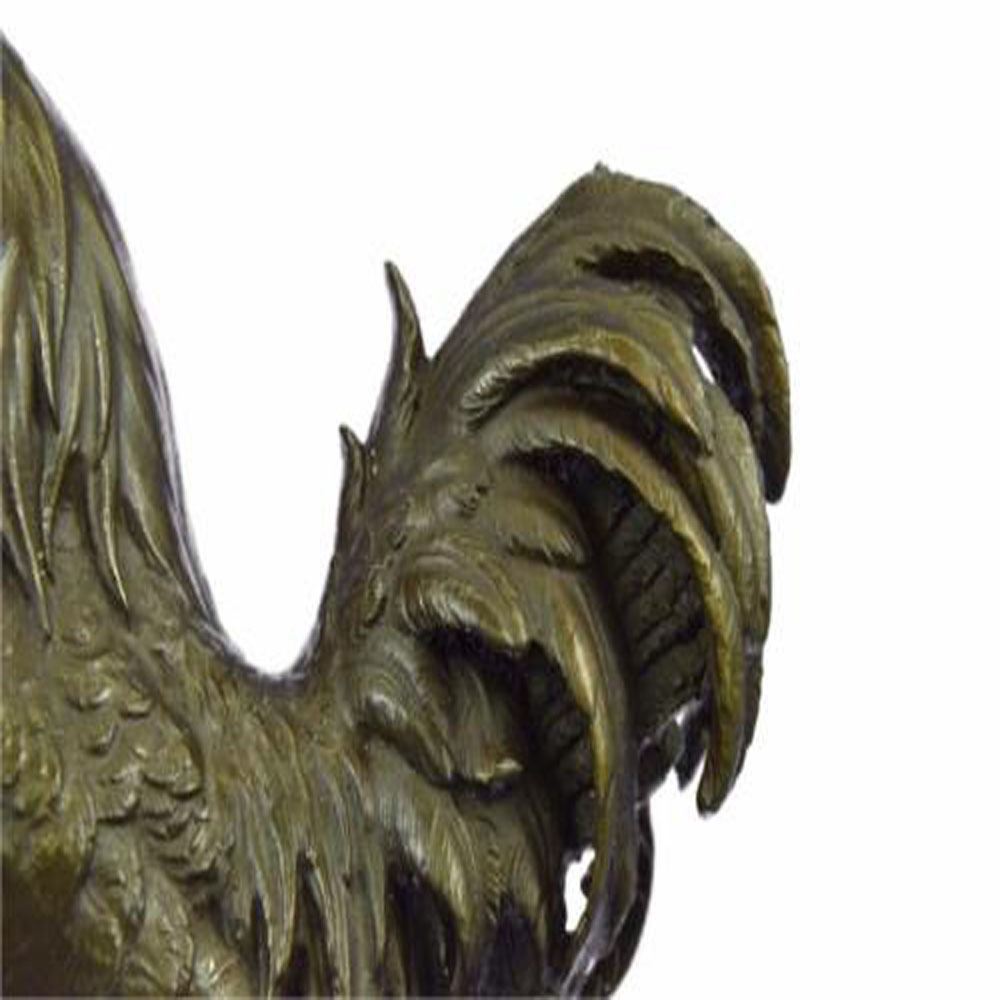 The rooster, in it’s exquisite feathered and colored costume, walks while crowing the early alarm of the break of dawn. He looks out defiantly at the viewer from under the wattles crowning his head. The ancient Greeks believed the Rooster rose to attention and saluted the sun every morning with a hearty cry, symbolizing victory over night. The bronze sculpture was produced using the lost wax technique allowing the artist to create beautiful and realistic details in his plumage. It is coated in a brown patina finish for preservation and mounted upon a marble base. Bronze Dimensions with Marble Base: Height 9 X Width 6 Inches. Weight: 5 LBS.