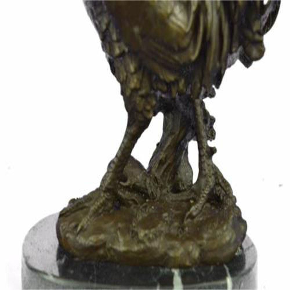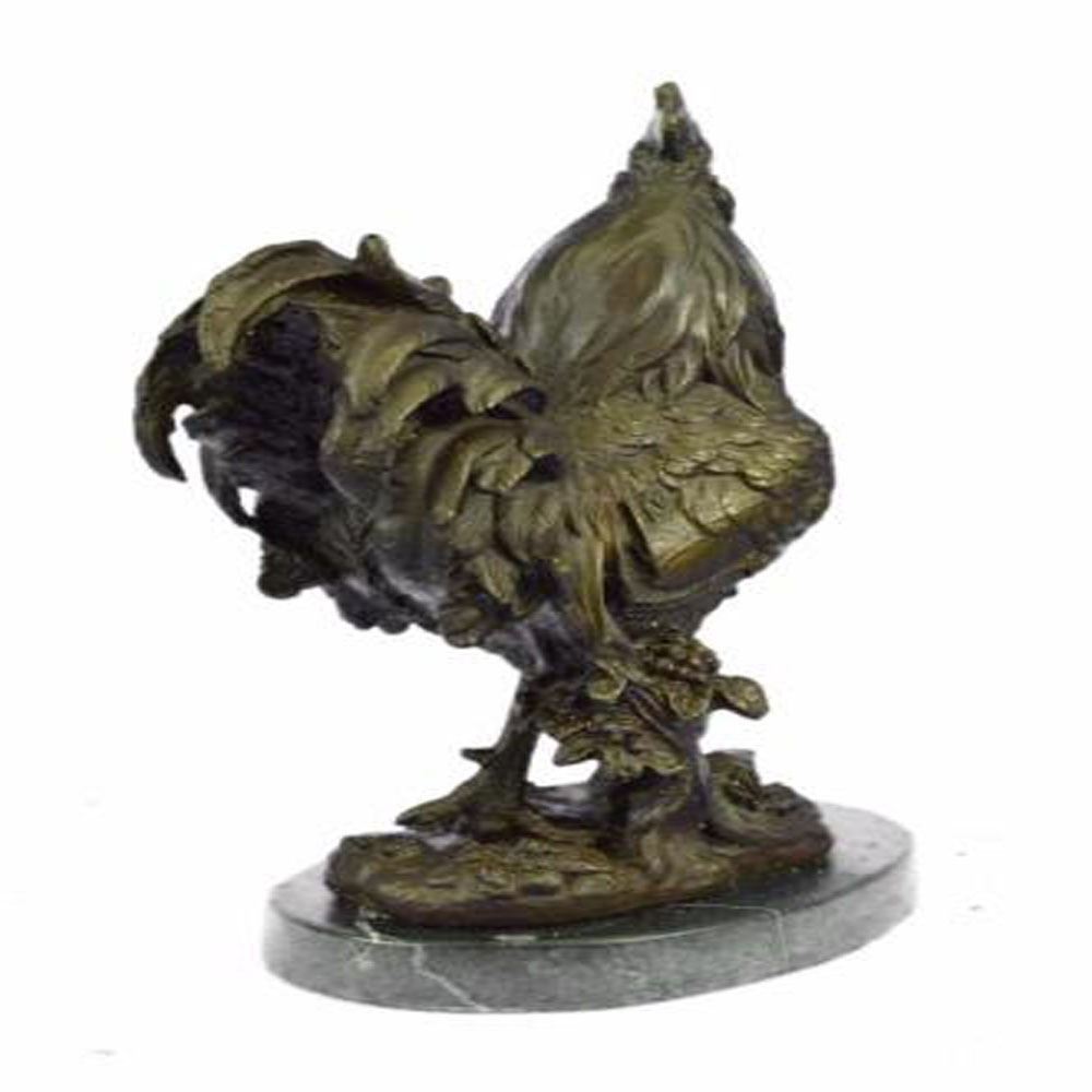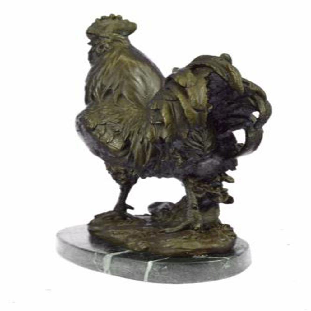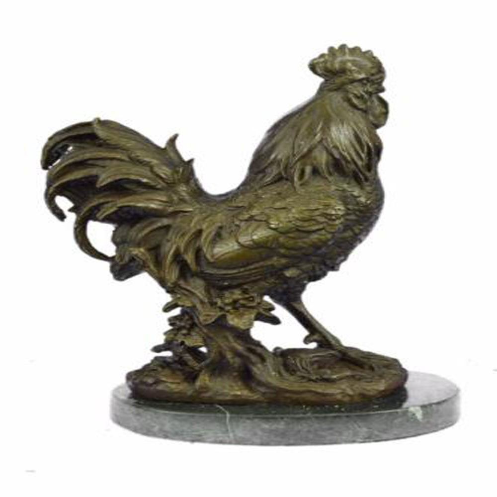 The rooster, in it’s exquisite feathered and colored costume, walks while crowing the early alarm of the break of dawn. He looks out defiantly at the viewer from under the wattles crowning his head. The ancient Greeks believed the Rooster rose to attention and saluted the sun every morning with a hearty cry, symbolizing victory over night. The bronze sculpture was produced using the lost wax technique allowing the artist to create beautiful and realistic details in his plumage. It is coated in a brown patina finish for preservation and mounted upon a marble base. Bronze Dimensions with Marble Base: Height 9 X Width 6 Inches. Weight: 5 LBS.