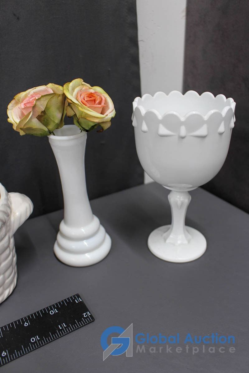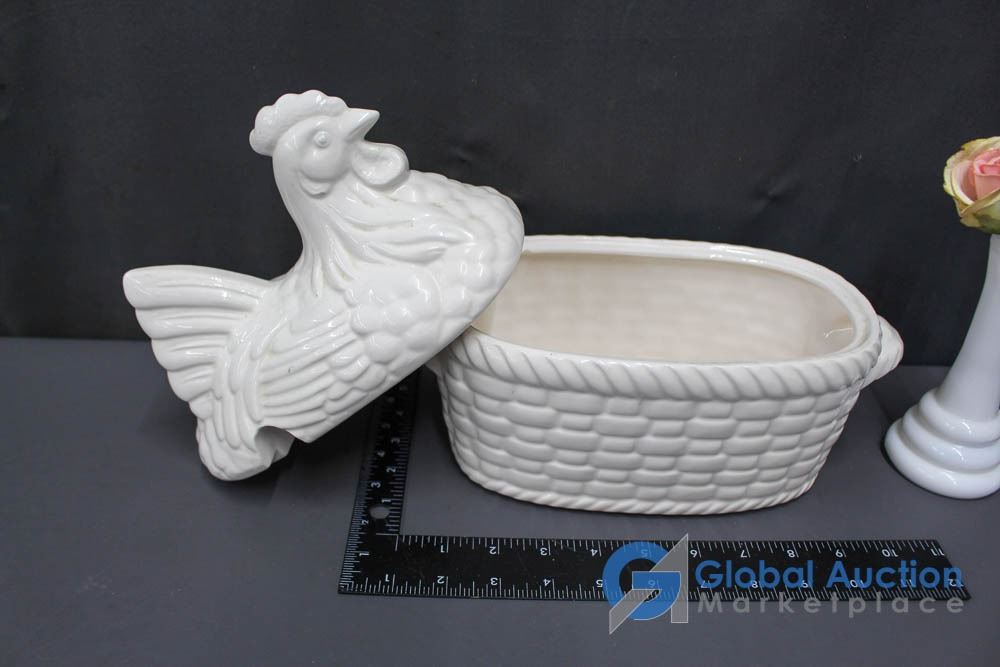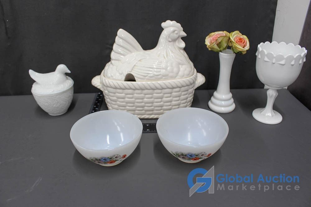 Rooster Serving Dish (Missing Ladle), Bird in a Nest Dish, Milk Glass Bowls