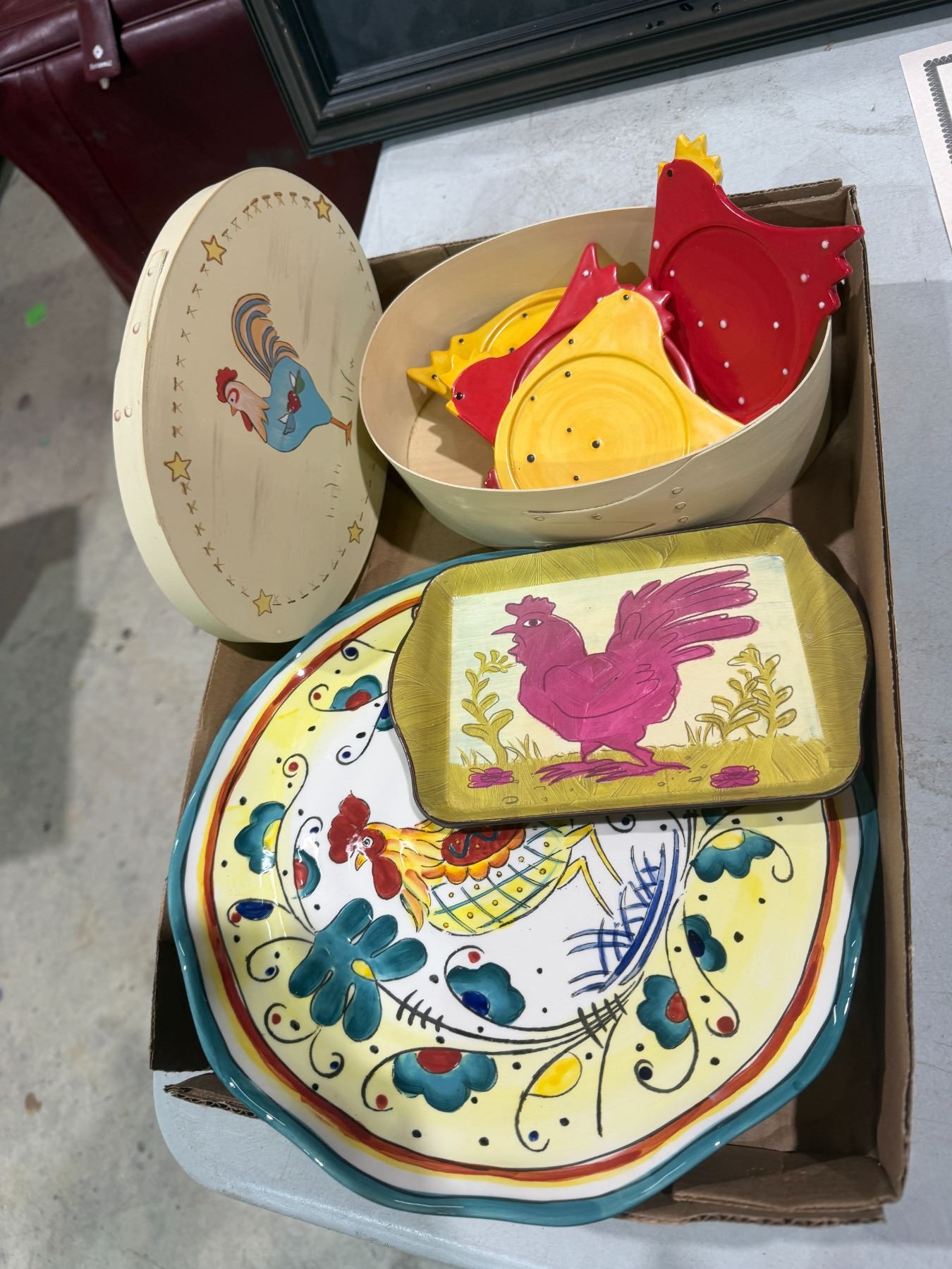Rooster, coasters and trays, etc.