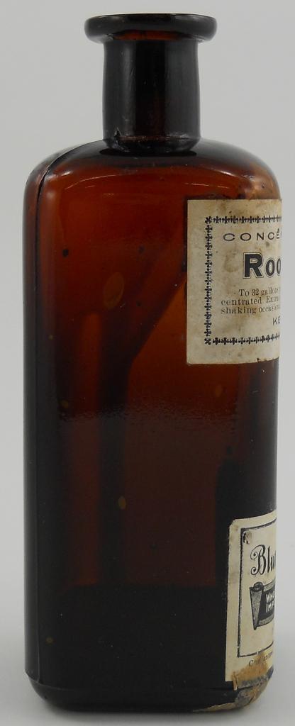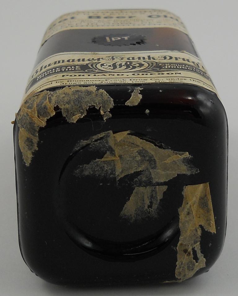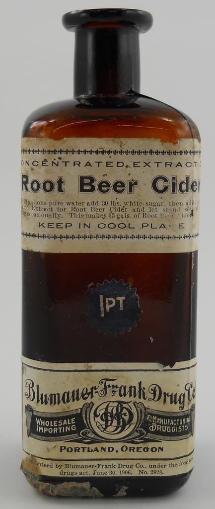 Blumauer Frank Drug Co. of Portland, Oregon bottled or sold this bottle of Root Beer Cider Concentrated Extract. The cork is stuck part way down the bottle and there is a small amount of the contents still inside (which should not be consumed).