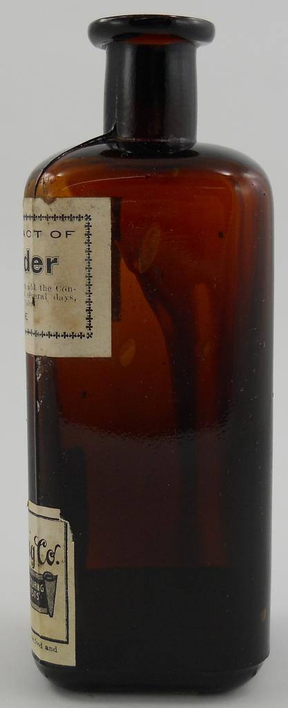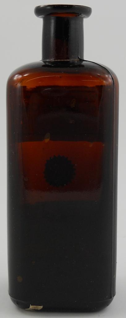 There is a little of the glassine paper still on the bottom of the bottle, which is 2-½ inches x 2-½ inches x - ¼ inches tall. The glass is amber, with the original paper labels.