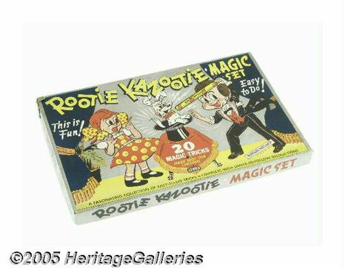 <B>Rootie Kazootie Magic Set (Zenith Toy, 1950s).</B></I> Fans of "Rootie Kazootie" will be pleased to see a number of Kazootie-related items in the Jacobs collection. One of the scarcest in this particular Zenith Toy set. Seldom seen, the wonderful color box illustration of Rootie, Polka Dottie and Gala Poochie will bring back all kinds of great memories for early television fans. The box is complete; no fading, sharp colors. There are a couple of edge tears, some wear to extremities. Most of the interior magic tricks appear to be present (and the metal pieces show no rusting). Great addition to a collection. <I>From the Larry Jacobs Collection.</B></I>