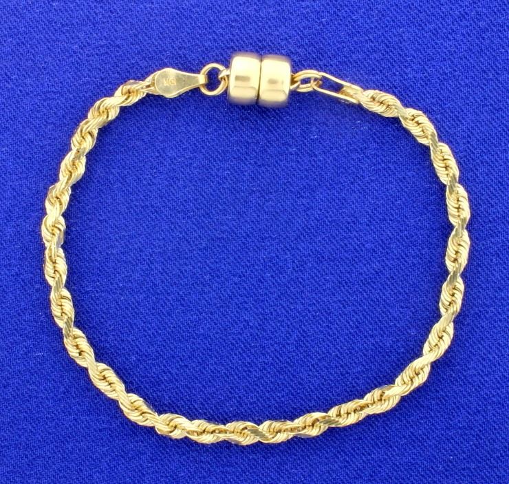 In 10K yellow gold it is 7 1/4 inches long and 3.5mm thick. It has a magnetic clasp for easy on/off. 7.4g