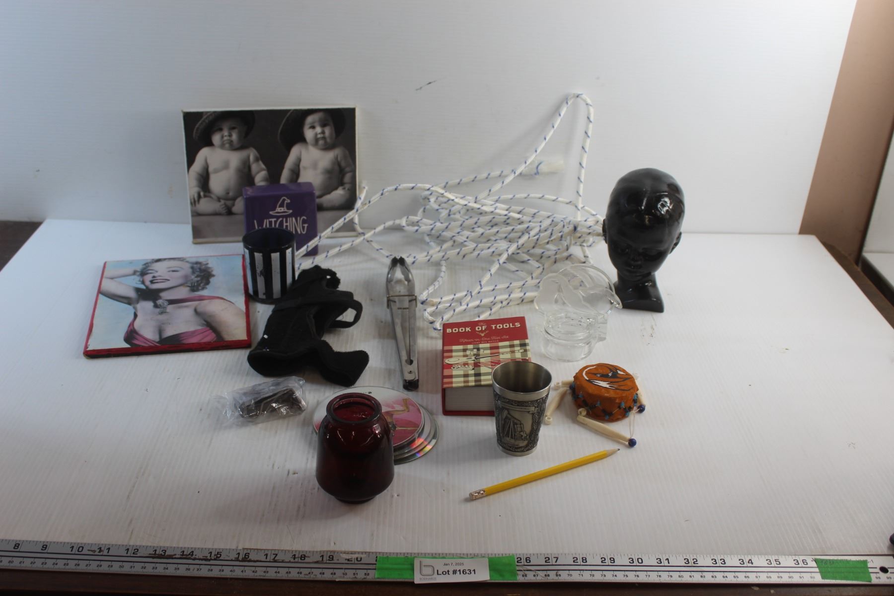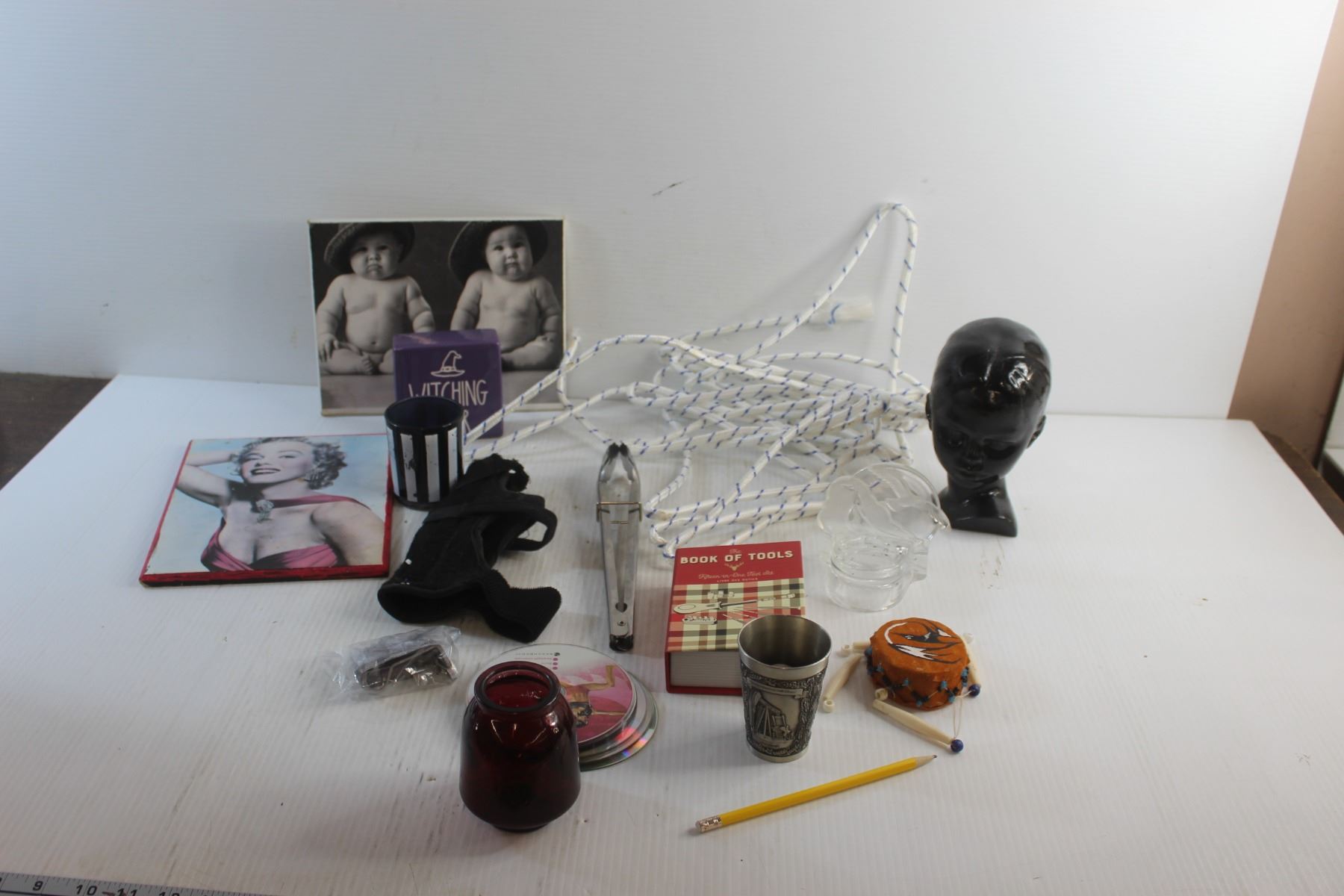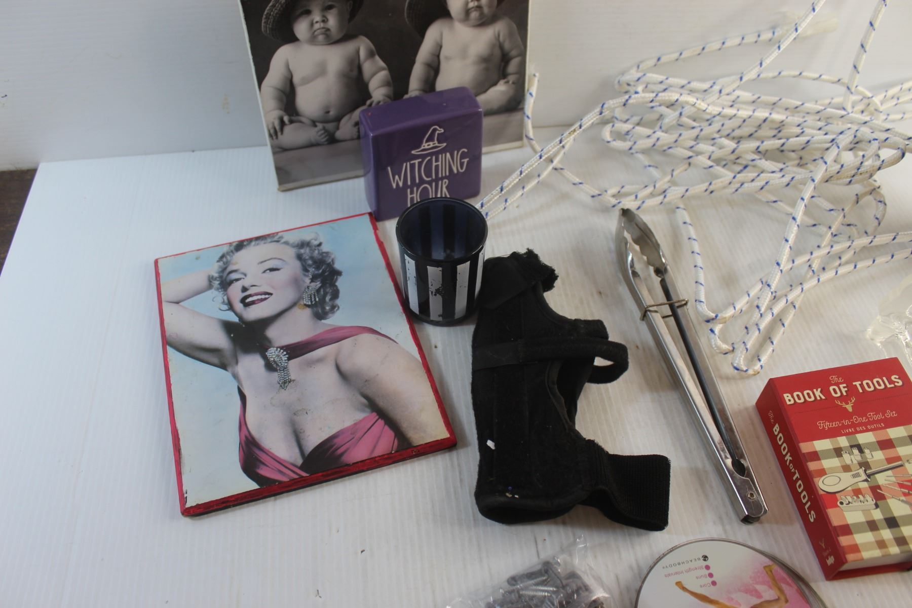 Rope, Tongs, Book of Tools, Ceramic Bust, Marylin Monroe Wall Decor, Audio CDs and Misc.
