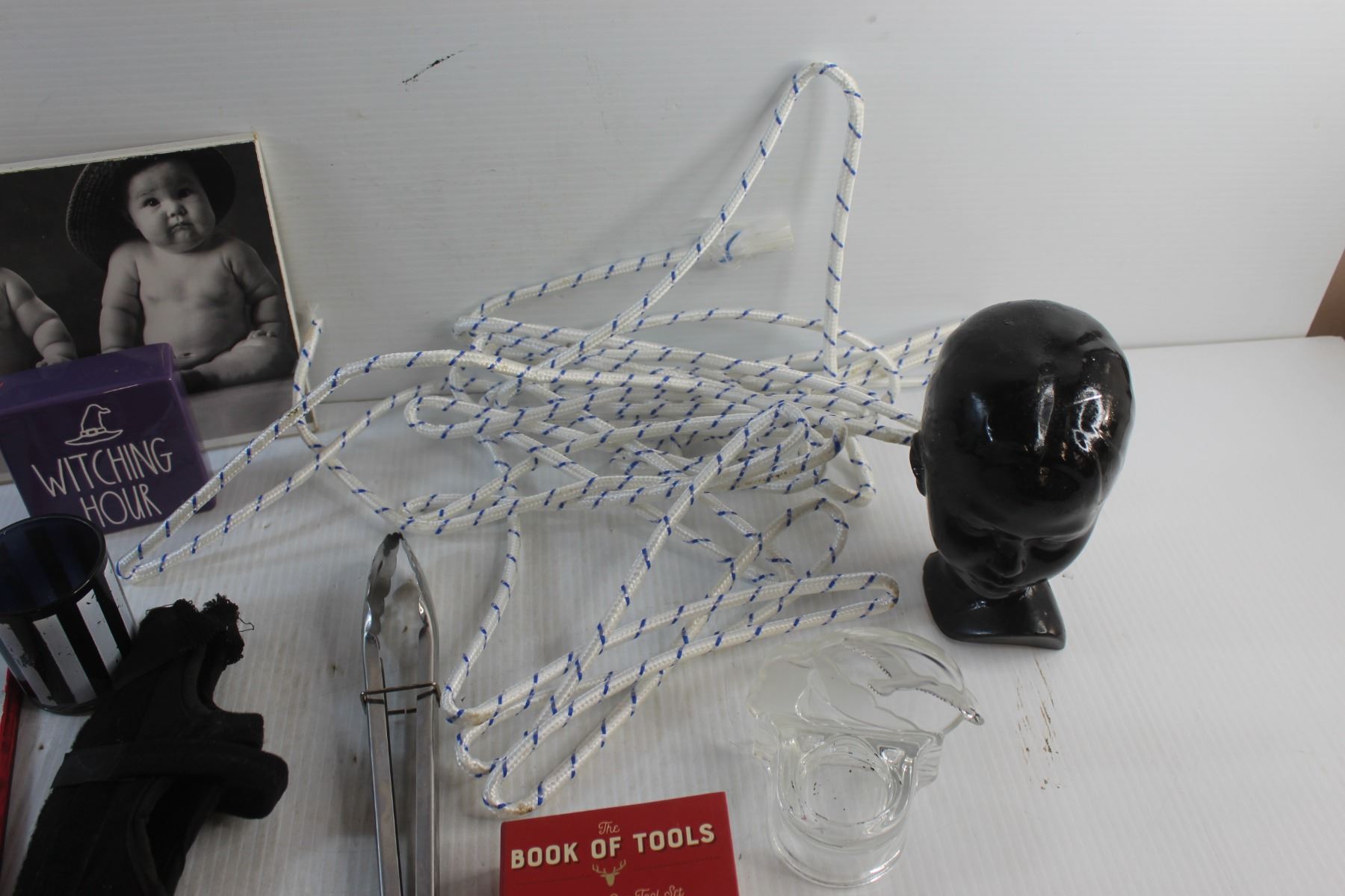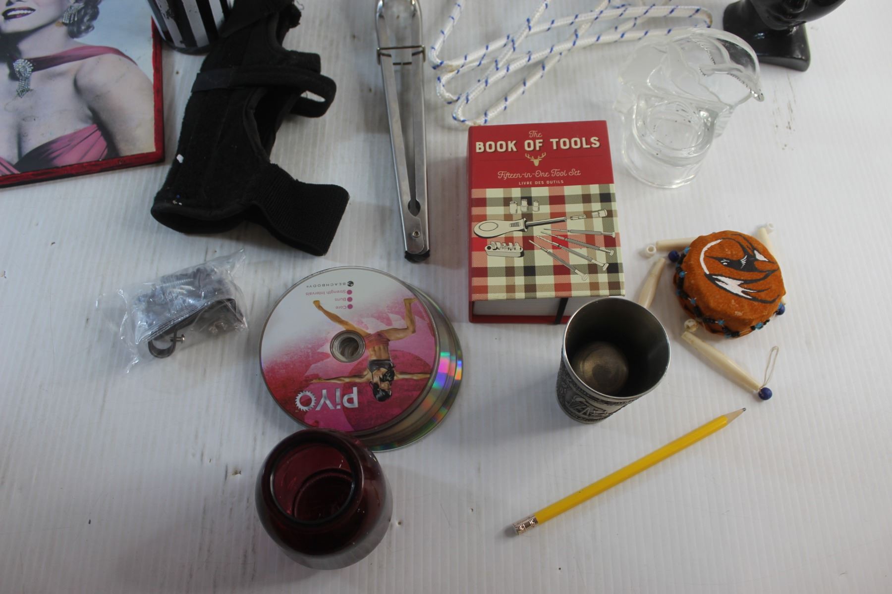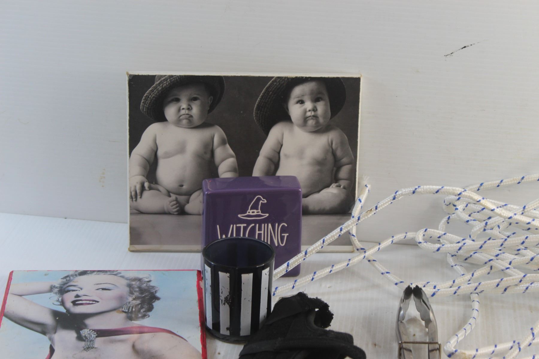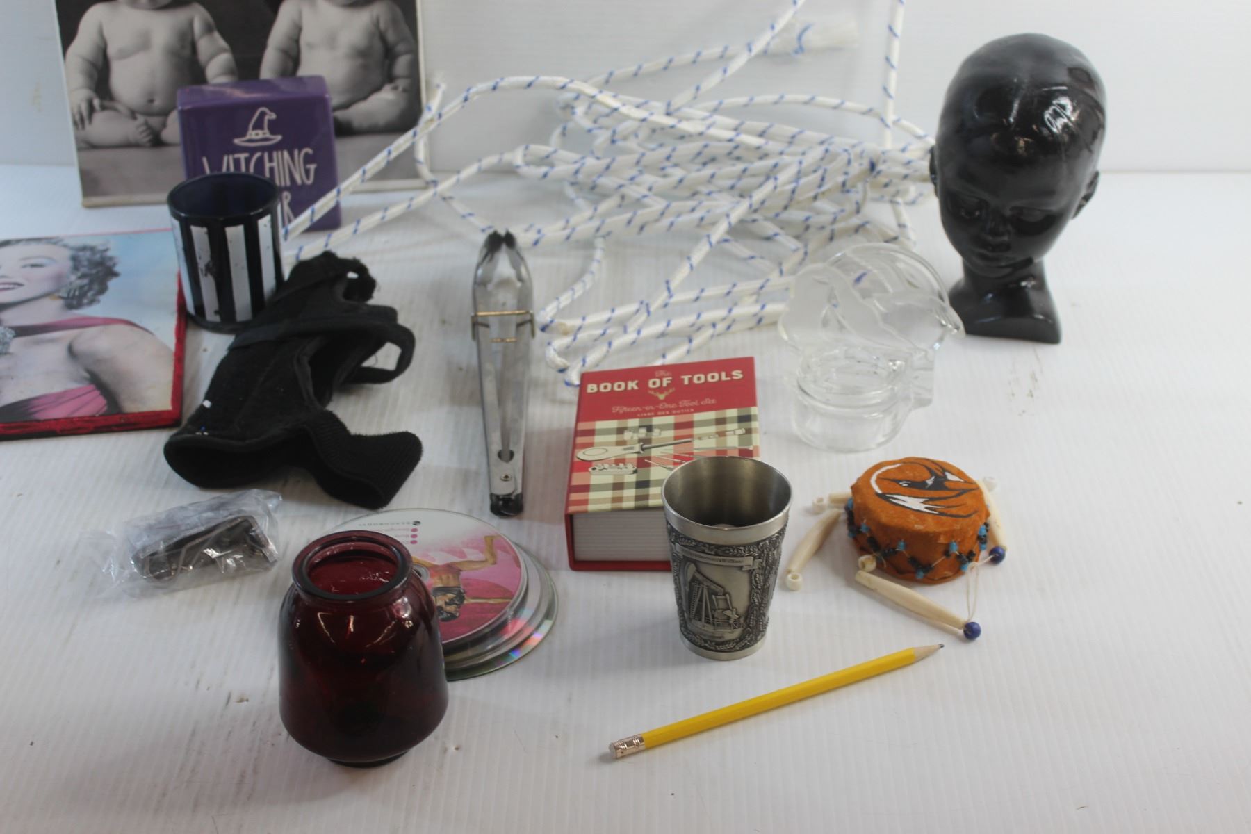 Rope, Tongs, Book of Tools, Ceramic Bust, Marylin Monroe Wall Decor, Audio CDs and Misc.