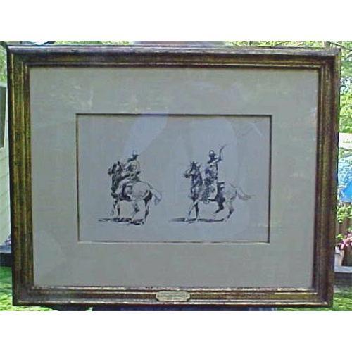 John Edward Borein (1872 - 1945) was the oldest of five children of the deputy sheriff of San Leandro, a town along one of the California cattle trails. Shortly after Edward's birth, the family moved to nearby Oakland, a major center in the cattle industry. Borein's artistic inclinations became evident almost immediately; he was sketching at the tender age of five, before most children can write. <p>The subjects available to him during his childhood--cowboys, Hispanic vaqueros, longhorn cattle, horses--determined his lifelong interests. Perhaps contrary to what one might expect in the rough environment of a cattle town, Borein was encouraged by his family to pursue art studies. His formal education at the San Francisco Art Association Art School, however, lasted just one month before he decided to give it up to become a cowboy. <p> Pen and ink drawing. Image size 7 1/2 inches X 11 1/2 inches. Unsigned, Comes with a certificate of authentication by Arlington Gallery of California. Fully professionally framed . Excellent condition. See all photos, please excuse the reflections.