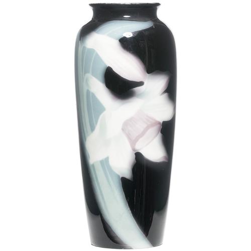 Rorstrand vase, tapered porcelain form in black with a colorful daffodil design, initials N.L., marked, #13567,9in.h