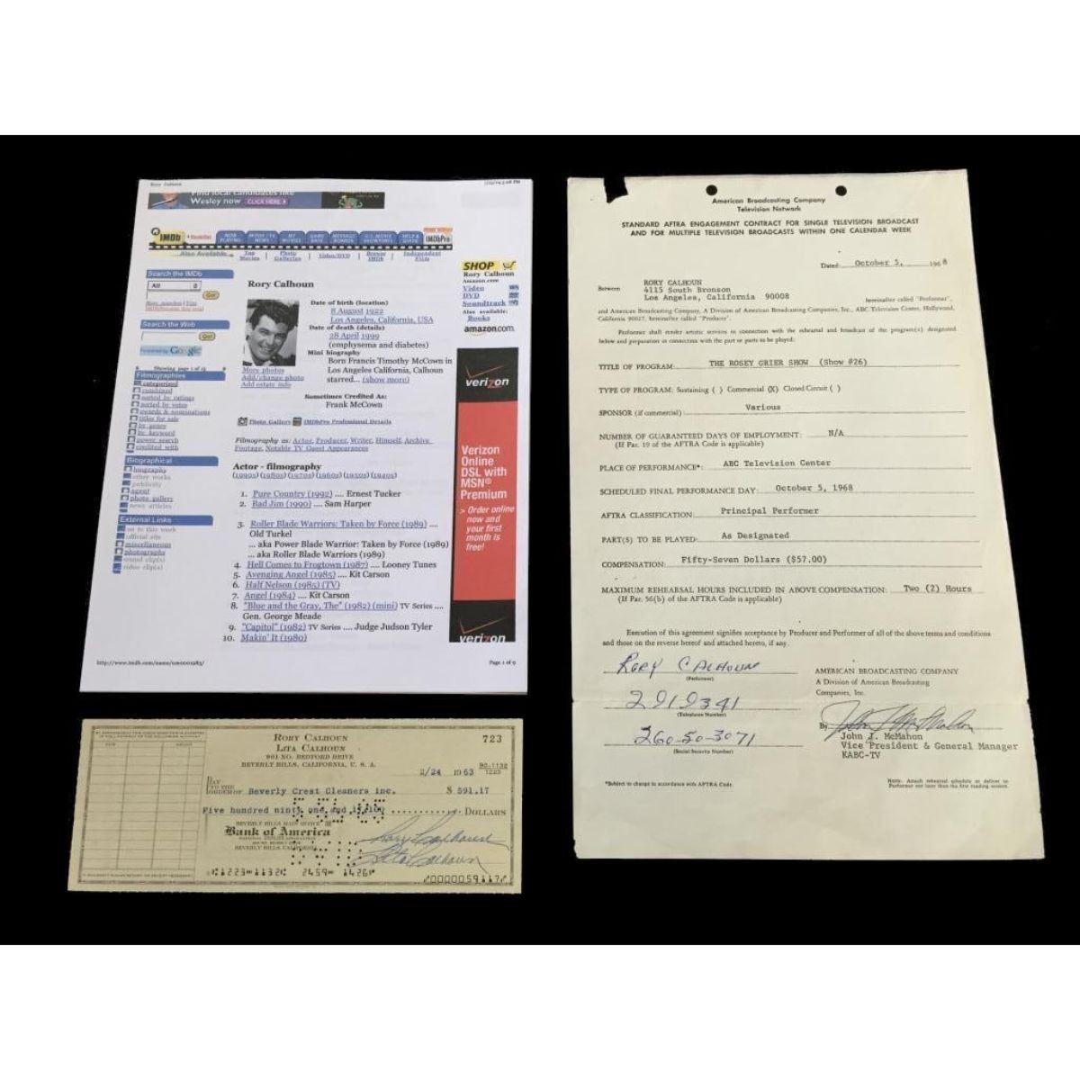 Authentic signatures of famous mid 20th century western movie star legend Rory Calhoun - including; a personal check dated 1963 & a television contract, dated 1968, for the Rosey Grier Show. Contract also signed