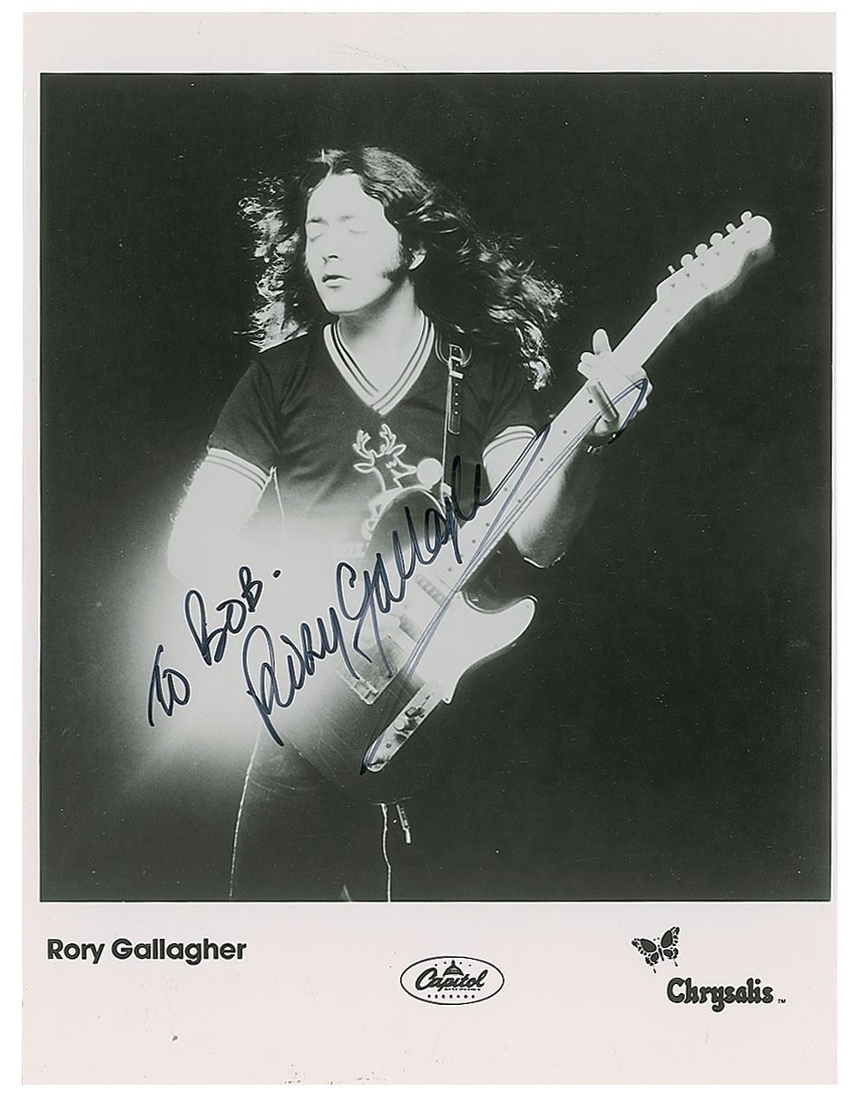 Glossy 8 x 10 Capitol/Chrysalis publicity photo, signed and inscribed in black felt tip to Capitol executive Bob Roper, "To Bob, Rory Gallagher.” In fine condition, with a trimmed right edge. Accompanied by a letter of provenance from Roper, stating that the autograph was obtained in person.