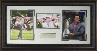 Rory McIlroy is a member of both the European and PGA Tours. After a week off following his Open victory in 2014, McIlroy won his first World Golf Championship event at the WGC-Bridgestone Invitational at Firestone and returned to world number one. Starting the final day three shots behind Sergio García, McIlroy shot a 66 to finish on 15 under par and two strokes clear. The following week, he won the PGA Championship at Valhalla for his fourth major, one shot ahead of runner-up Phil Mickelson. He has been cited as the most exciting young prospect in golf and as having the potential to become one of the highest earners in sports in terms of endorsements. This is a Rory McIlory 3 Photo Piece from the 2014 British Open with Custom Matting and Premium Leather Framing to Approx 17x35 size.