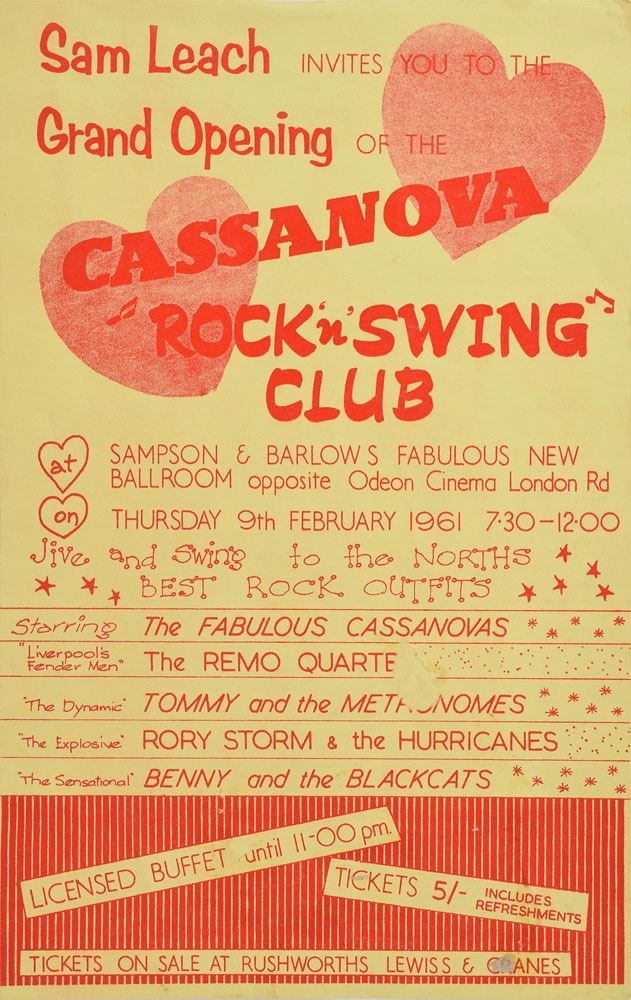 Vintage red-and-yellow 8.25 x 13 concert poster for the "Grand Opening of the Cassanova Rock 'n' Swing Club at Samson and Barlow's Fabulous New Ballroom" on London Road in Liverpool, on February 9, 1961. The musical acts include: The Fabulous Cassanovas, The Remo Quartet, Tommy and the Metronomes, Rory Storm and the Hurricanes, and Benny and the Blackcats. In fine condition, with a couple of small areas of surface loss and old mounting traces on the reverse. Accompanied by a certificate of authenticity from Tracks. Ringo Starr played drums for Rory Storm and The Hurricanes before leaving the band in mid-August of 1962 and replacing Pete Best as the Beatles' full-time drummer. Interestingly, the Beatles made their debut performance at the Cavern Club on the same date as this concert. Consignor notes that this poster originates from the collection of Johnny Byrne, the guitarist for Rory Storm and the Hurricanes.