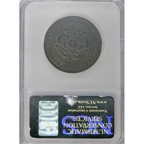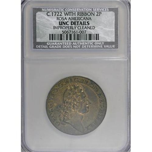 <B>Undated 2PENCE Rosa Americana Twopence, Label--Improperly Cleaned--NCS.</B></I> <B>Unc. Details.</B></I> Breen-88, "Very scarce." Double struck, the piece rotated a degree or two between strikes. The legends on both sides exhibit evidence of the double strike, but the spread is widest on the back of the bust. The dies are rotated 90 degrees from coin turn. The obverse is bright from a moderate cleaning and has a small area of granular surface near the hair ribbons. The reverse has mostly toned brown and has a more original appearance. Listed on page 40 of the 2008 <I>Guide Book.<BR>Ex: Oak Collection of American Colonial Coinage (Heritage, 9/05), lot 15, which realized $1,840.<BR>From The Liberty Collection of United States Colonial Coinage.</B></I><BR><BR><b>Shipping:</b> Coins & Currency (<a target="_blank" href="http://www.heritageauctions.com/common/shipping.php">view shipping information</a>)