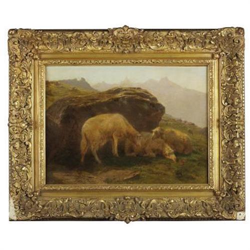 <B>ROSA BONHEUR (French, 1822-1899)</B></I><BR><I>Sheep on a Hillside</B></I>, 1862<BR>Oil on canvas<BR>10-1/4 x 14-1/8 inches (26.2 x 35.9 cm)<BR>Signed and dated lower left: <I>R. Bonheur/1862</B></I><BR>