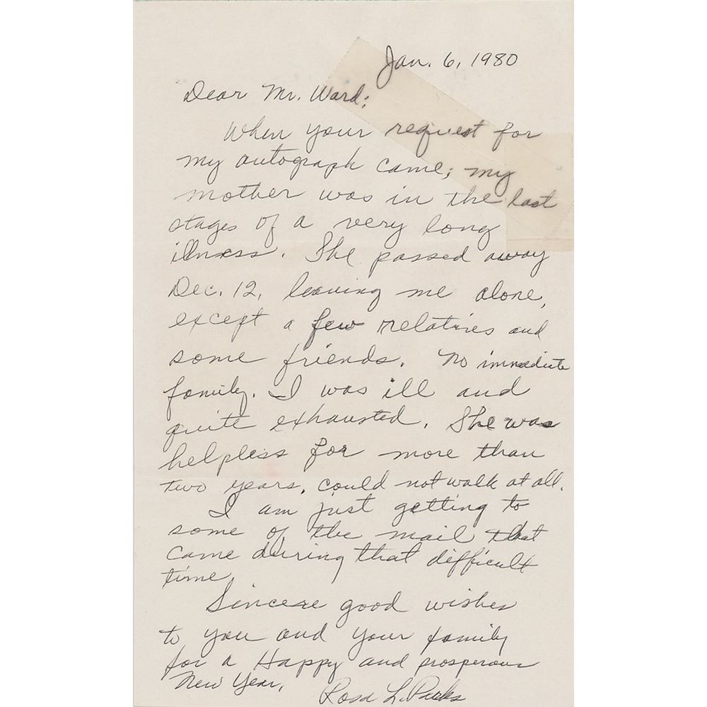ALS signed “Rosa L. Parks,” one page, 5 x 8, January 6, 1980. Somber handwritten letter to Ed Ward, in part: "When your request for my autograph came, my mother was in the last stages of a very long illness. She passed away Dec. 12, leaving me alone, except a few relations and some friends. No immediate family. I was ill and quite exhausted. She was helpless for more than two years and could not walk at all. I am just getting to some of the mail that came during that difficult time.” In very good to fine condition, with a tear to the top, repaired with scotch tape. Accompanied by the original mailing envelope, which bears Parks's autograph in the return address field.